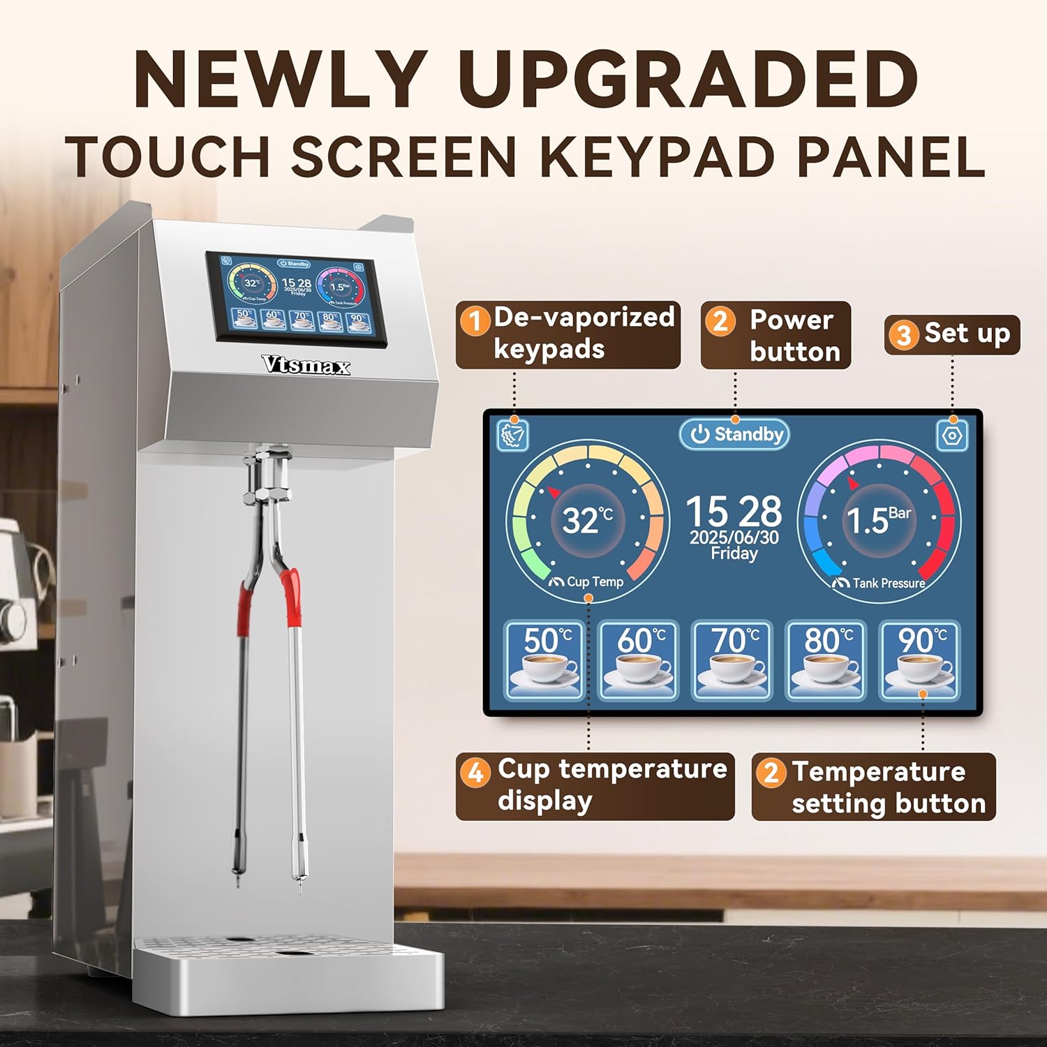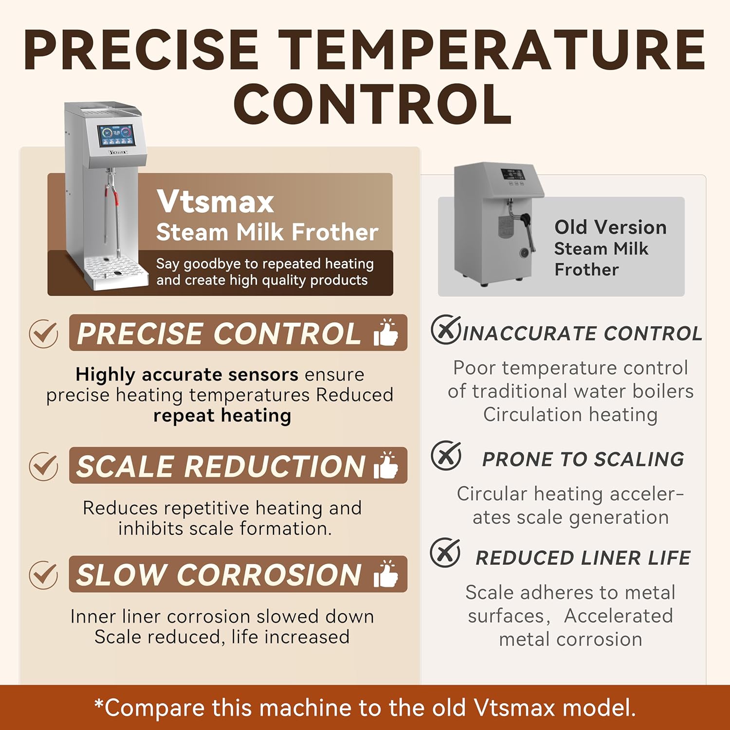 - 【Durable & long lasting】: Vtsmax milk frother is made of high pressure resistant double thickened 304 stainless steel for superior durability and heat resistance for long term professional use. The milk frother and steamer contains an all-copper heating tube for fast heat conduction and strong scale adhesion resistance to prevent coffee stains and milk residue.