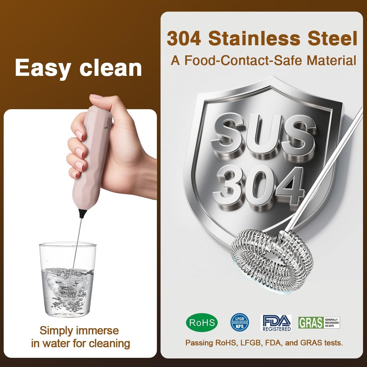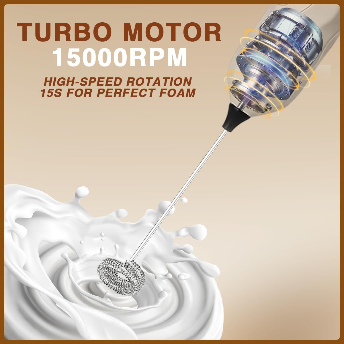 - Barista-Style Froth in 15 Seconds Whip up creamy, velvety foam for lattes, cappuccinos and matcha drinks with our professional handheld milk frother. The dual stainless steel whisks create rich, café-quality froth faster than single-whisk models. Ideal for coffee lovers who enjoy specialty drinks at home without expensive equipment.