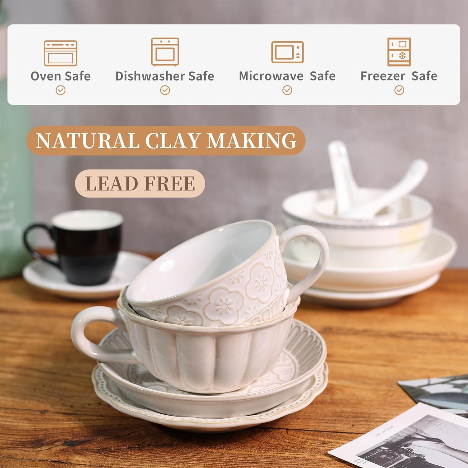 Latte Cup with Saucer, 12 OZ Cappuccino Cup Vintage Cafe Art Cups for Espresso Turkish Coffee, Farmhouse Latte Mugs Tea Cups and Saucers Porcelain Set for Baristas Great Gift