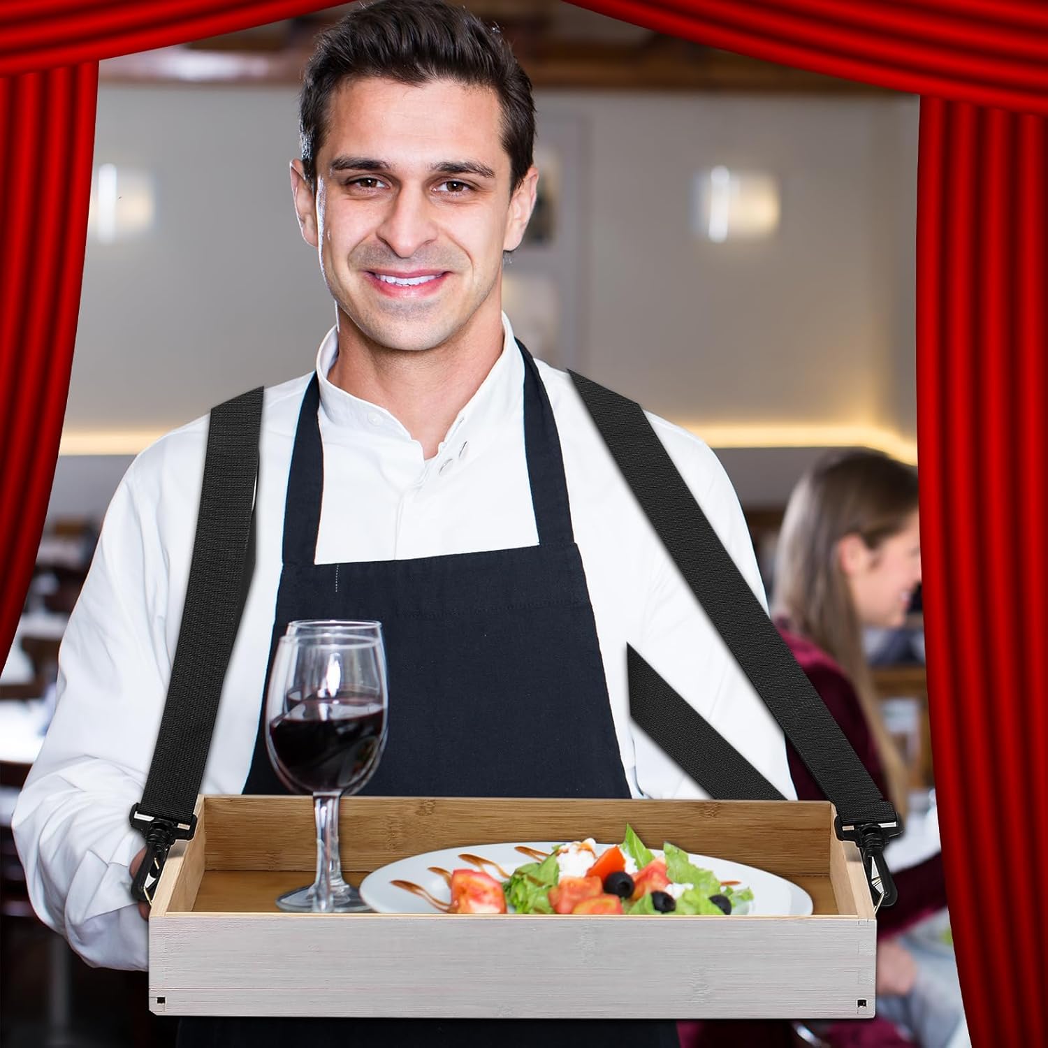 - Reliable and Sturdy: our retro beverage trays are made of quality wood, durable and safe, ensuring they can handle a variety of snacks and drinks without compromising quality; The straps are made of plastic and nylon materials, strong and lasting; You can tie a ribbon around your neck and back to easily fix the tray