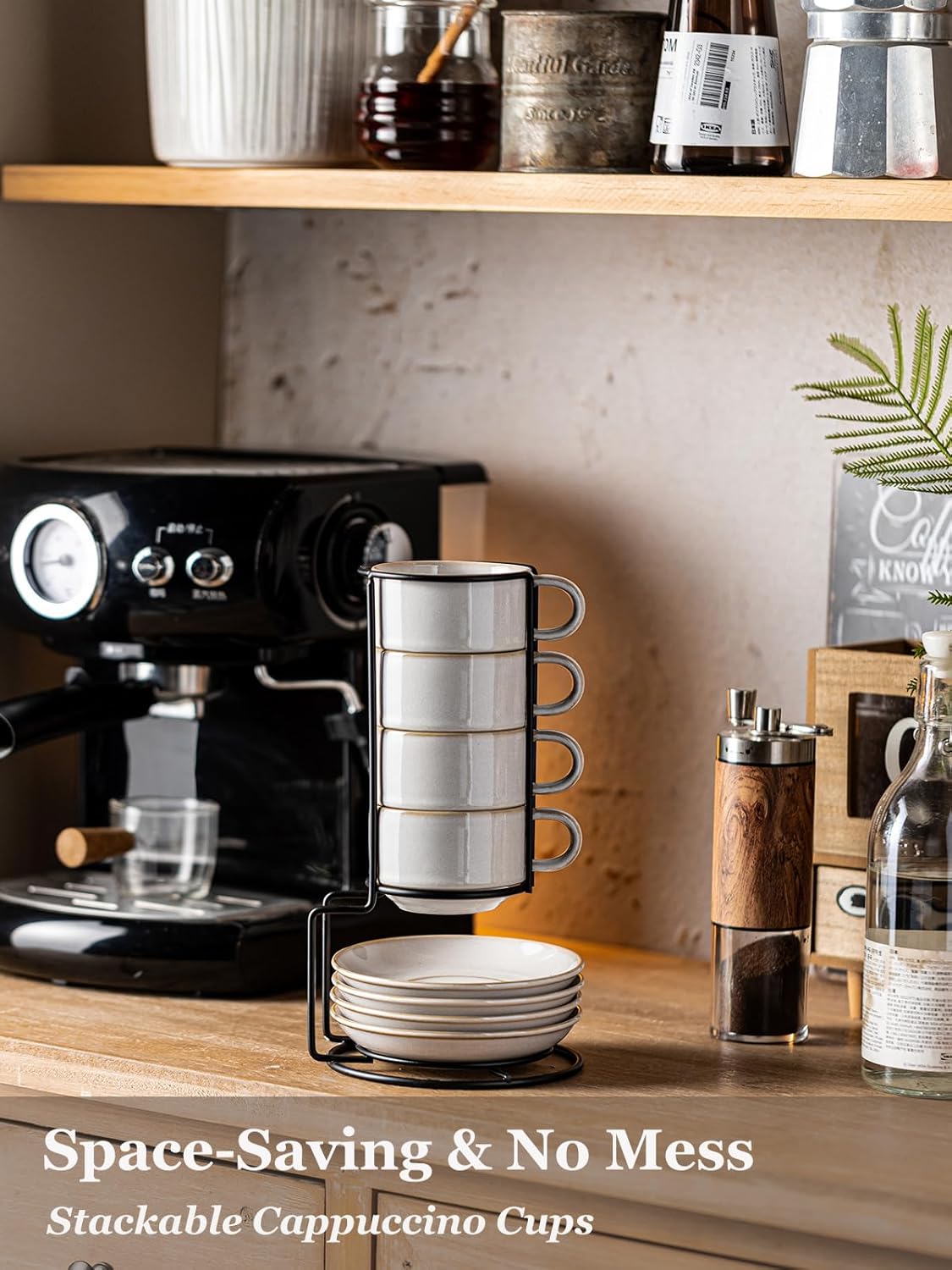 - STACKABLE & SAVE SPACE: Maximize counter space! These ceramic espresso cups stack inside of each other in the included metal rack, they are a breeze to store, making them ideal for small kitchens, coffee bars, or dorm rooms. Store vertically, save space!