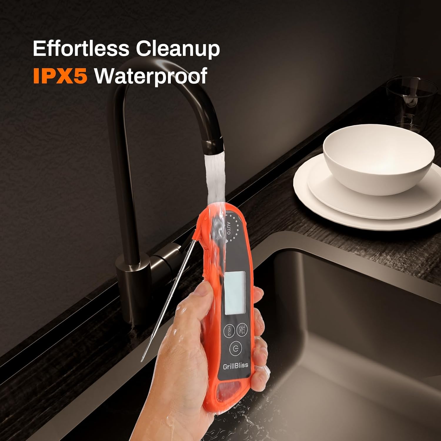 - IP65 Waterproof & Easy Storage - Messy kitchen? No problem. The IP65 waterproof design lets you rinse the food thermometer under running water without worry. The magnetic back sticks to your oven or fridge, and the hanging hole gives even more storage options, always within reach.