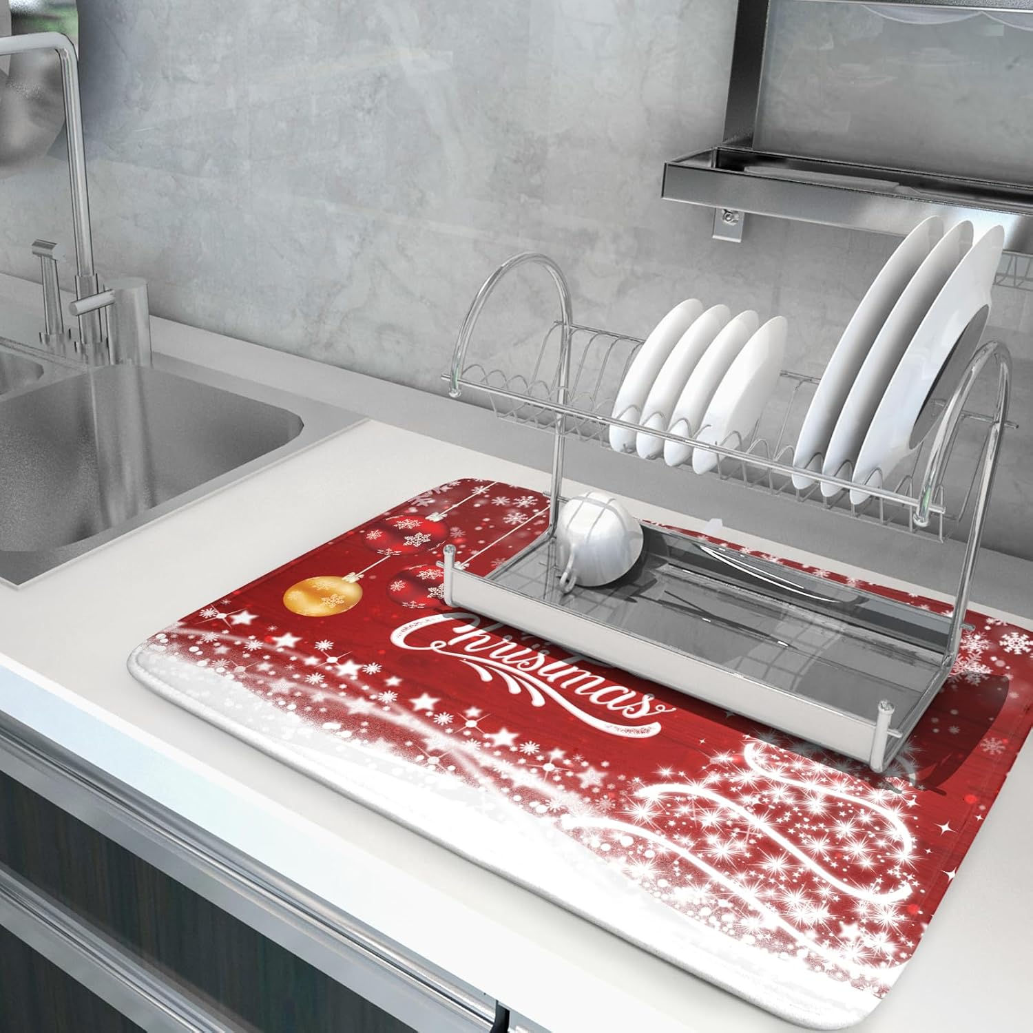 Merry Christmas Dish Drying Mat for Kitchen Counter Winter Snowflake Pine Fast Absorbent Red Drying Mat 16x18 Inch Xmas Jingle Bells Decoration Dishes Pad Dish Drainer Rack Mats Holiday Decor