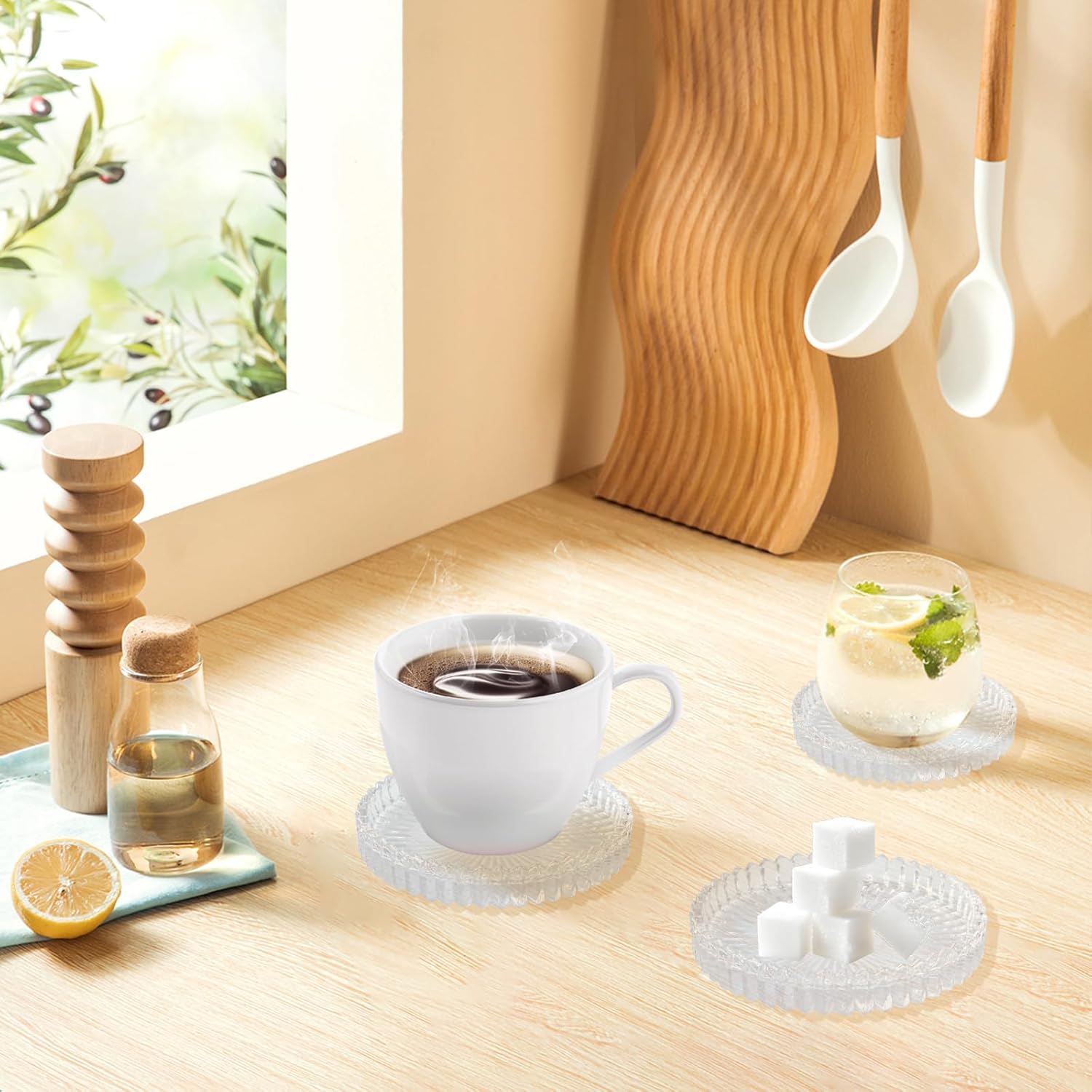 - High Quality - The glass coasters are made of strong hardness glass material,the thickened edge effectively prevents slipping and compression, avoids burns and water stains on the table, and will not deform after long-term use, protecting the furniture surface with greater peace of mind. (Due to differences in display screens and camera lighting, the glass coasters colors may vary)