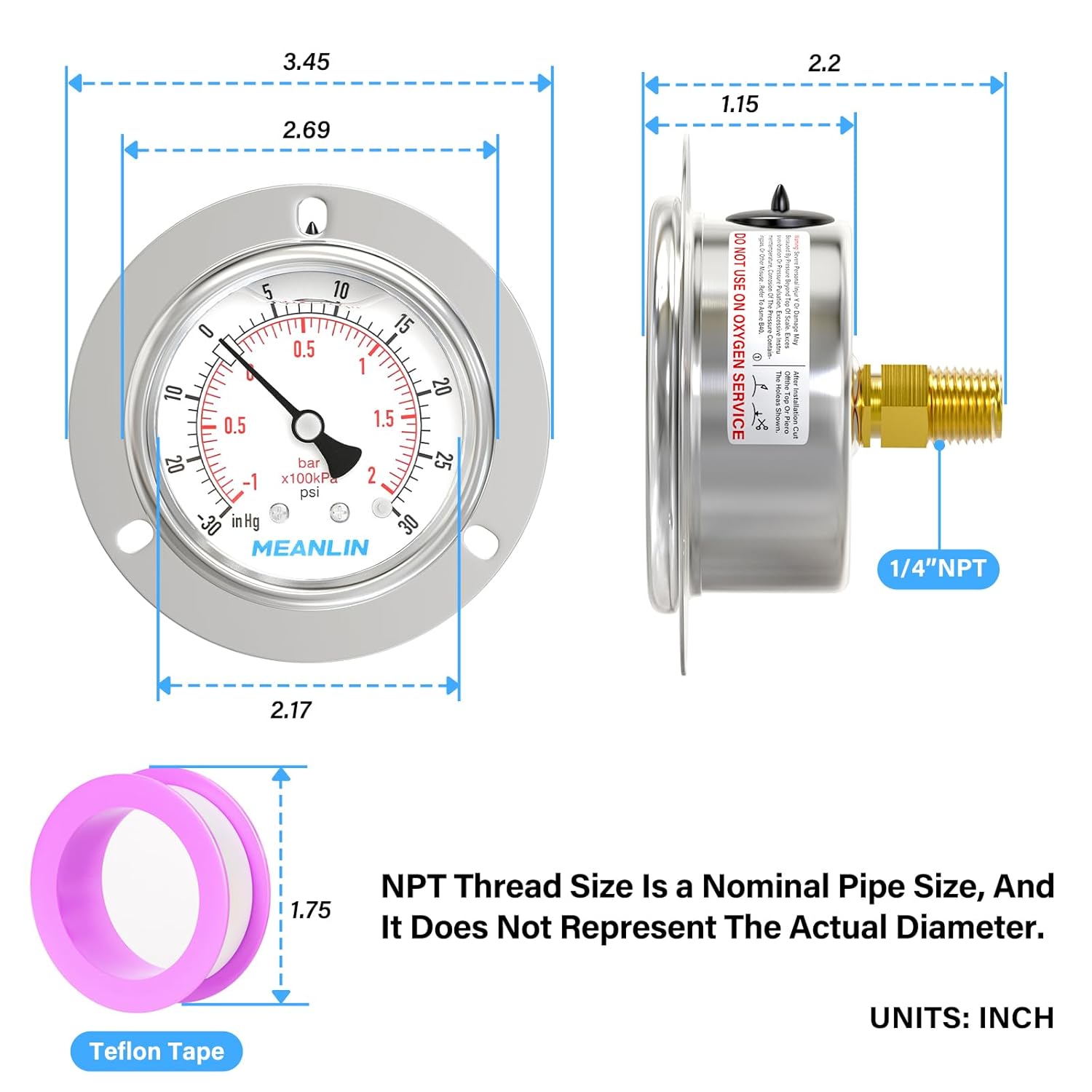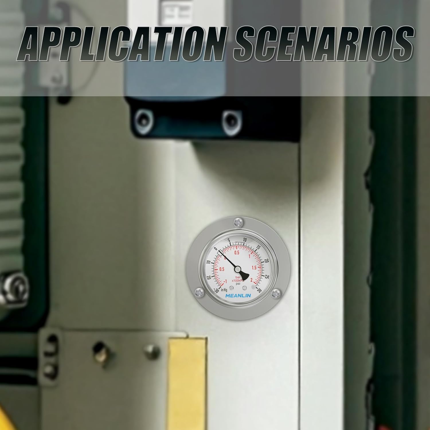 MEANLIN MEASURE -30inHG~30Psi Liquid Filled Pressure Gauge Front Flange Panel Mount, 1/4" NPT 2.5" FACE DIAL Stainless Steel Case with Phillips Screw and Nut, +/-3-2-3%