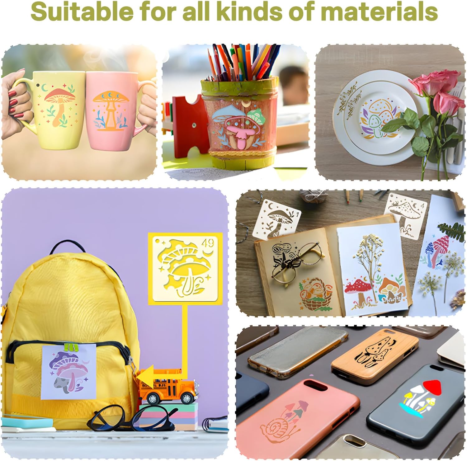 - 【Complete Stencil Set】64PCS 3x3 inch stencils for painting featuring various forest and mushroom patterns; Perfect for all your nature-themed creative projects