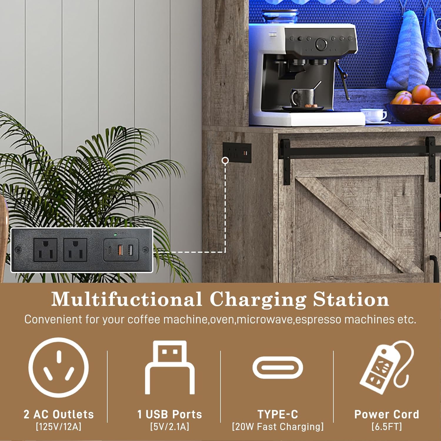 - 【Convenient Charging Sockets】 The Coffee bar cabinets comes with a built-in power outlet, which features 2 AC plugs and 2 USB ports,1 type-c, powering up your essentials like ice-maker, coffee maker, wine fridge or microwave is a breeze. Elevate your space effortlessly – sip, relax, and enjoy!
