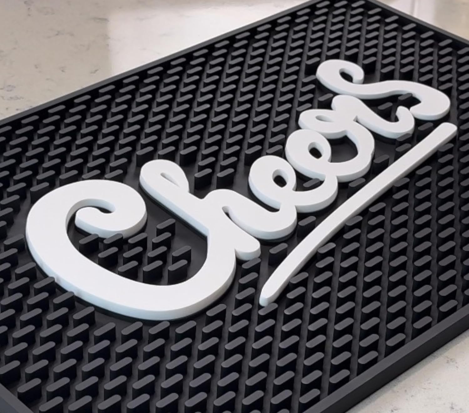 - Raise a Toast in Style - Turn your bar or kitchen counter into a happy place with this Tiki and Coffee bar mat that instantly adds charm and personality. The bold “Cheers” design makes it the perfect bar sign for every celebration.
