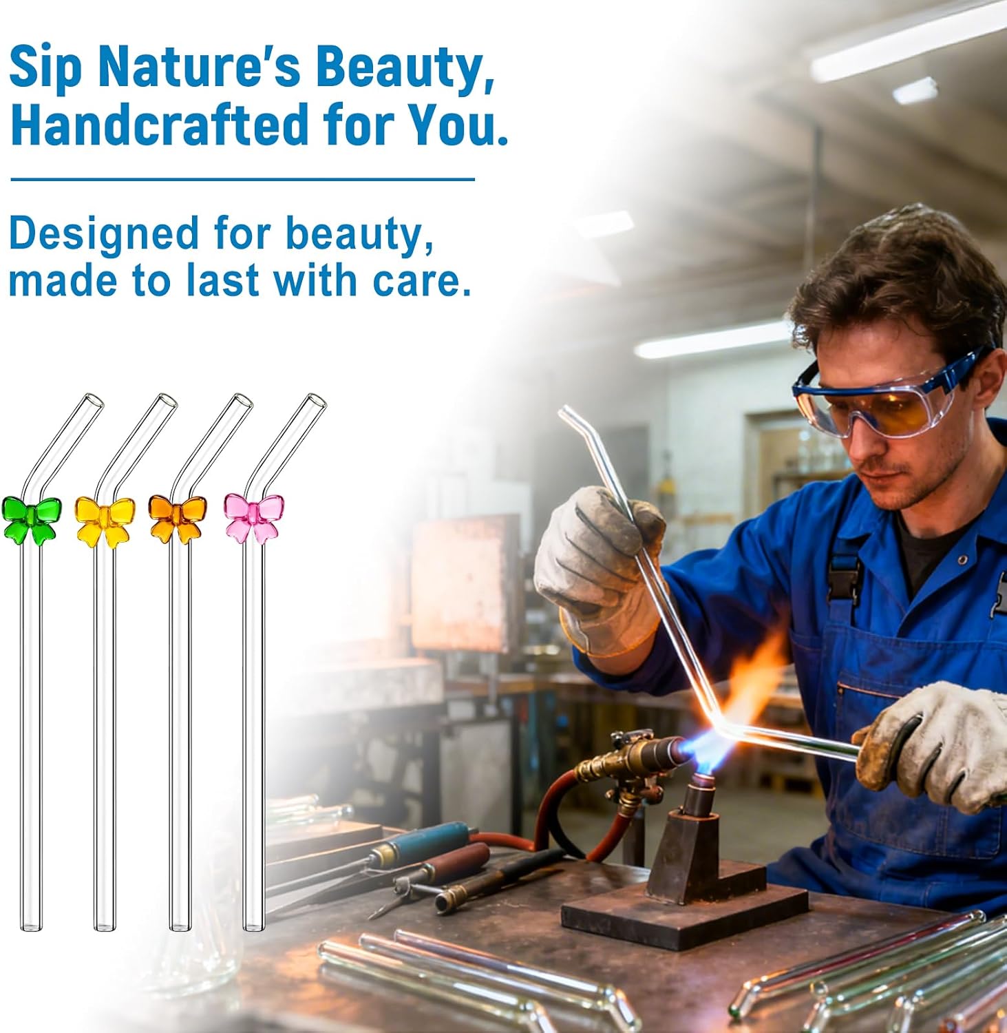 - 🎀 Handmade with Adorable Glass Bow Charms – Instagram-Worthy & Elegant: Each straw is artisan-crafted with a unique fused glass bow, available in a mix of pink, green, yellow, and amber. These charming glass straws bent and bendy straws glass designs add a playful yet elegant touch to any drink. Perfect for parties, gifts, or everyday use — they're the ultimate fun straws for adults and kids alike!
