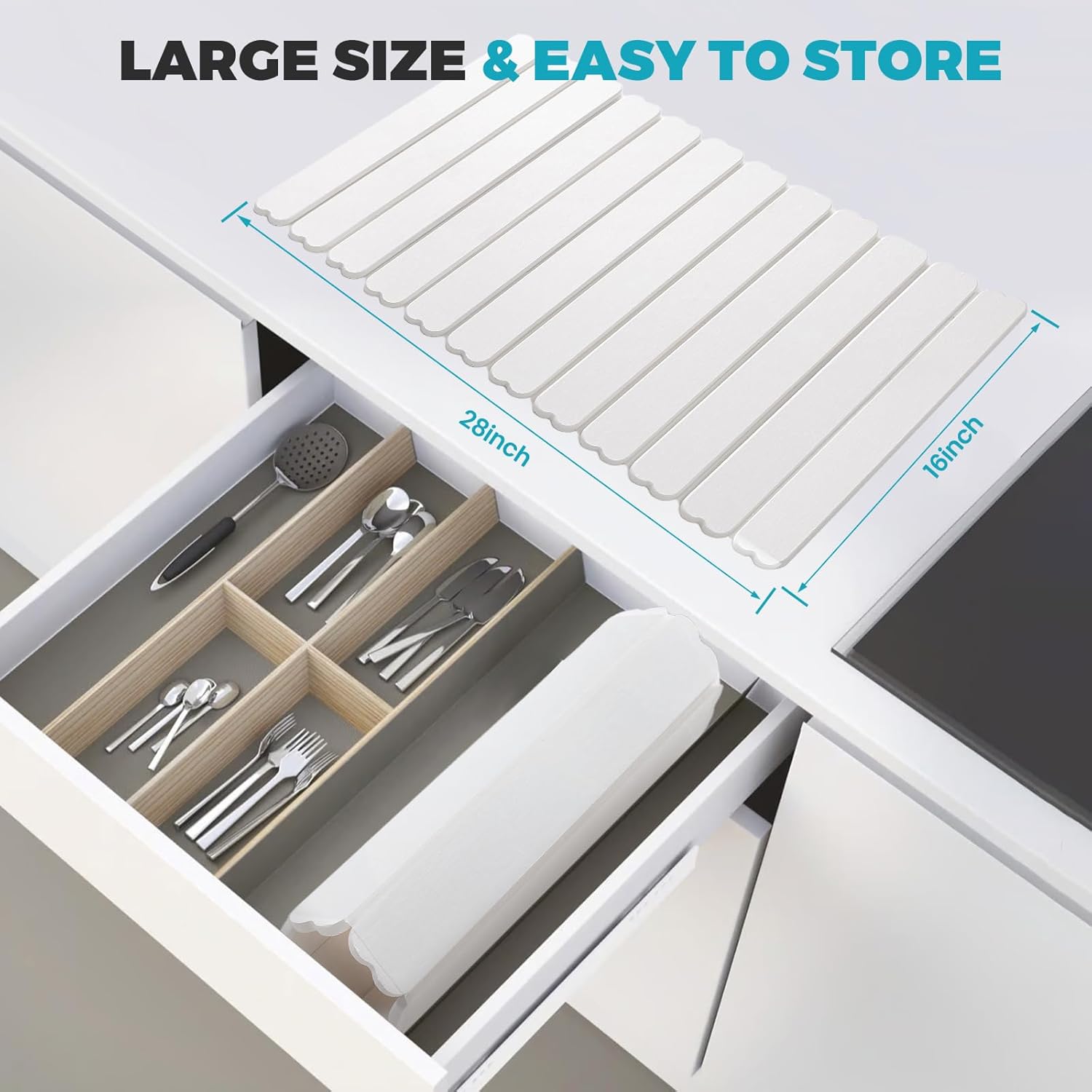 - Collapsible and Space-Saving: Measuring 28x16'' when unfolded, this collapsible stone drying mat offers ample space for your dishes. When not in use, easily store it in drawers or kitchen cabinets, maximizing your kitchen's organization