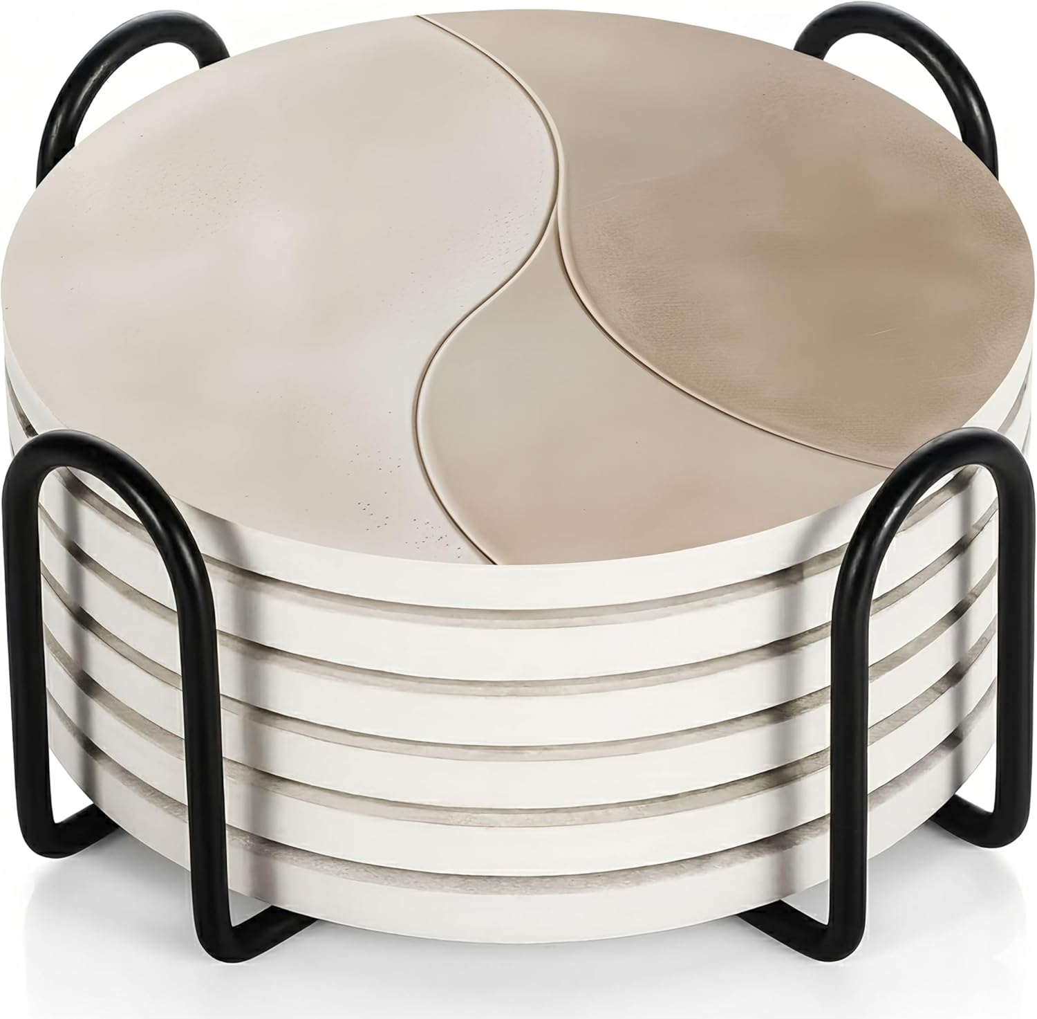- ABSORBENT CERAMIC STONE: VEYRO coasters for drinks are crafted from premium ceramic that is naturally absorbent, gently drawing in water rings and condensation before they touch your surfaces. Designed with balance and precision, they keep your coffee tables and desks spotless — so every sip feels calm, effortless, and beautifully in place. Perfectly sized for mugs, tumblers, wine glasses, and even vases or small planters.