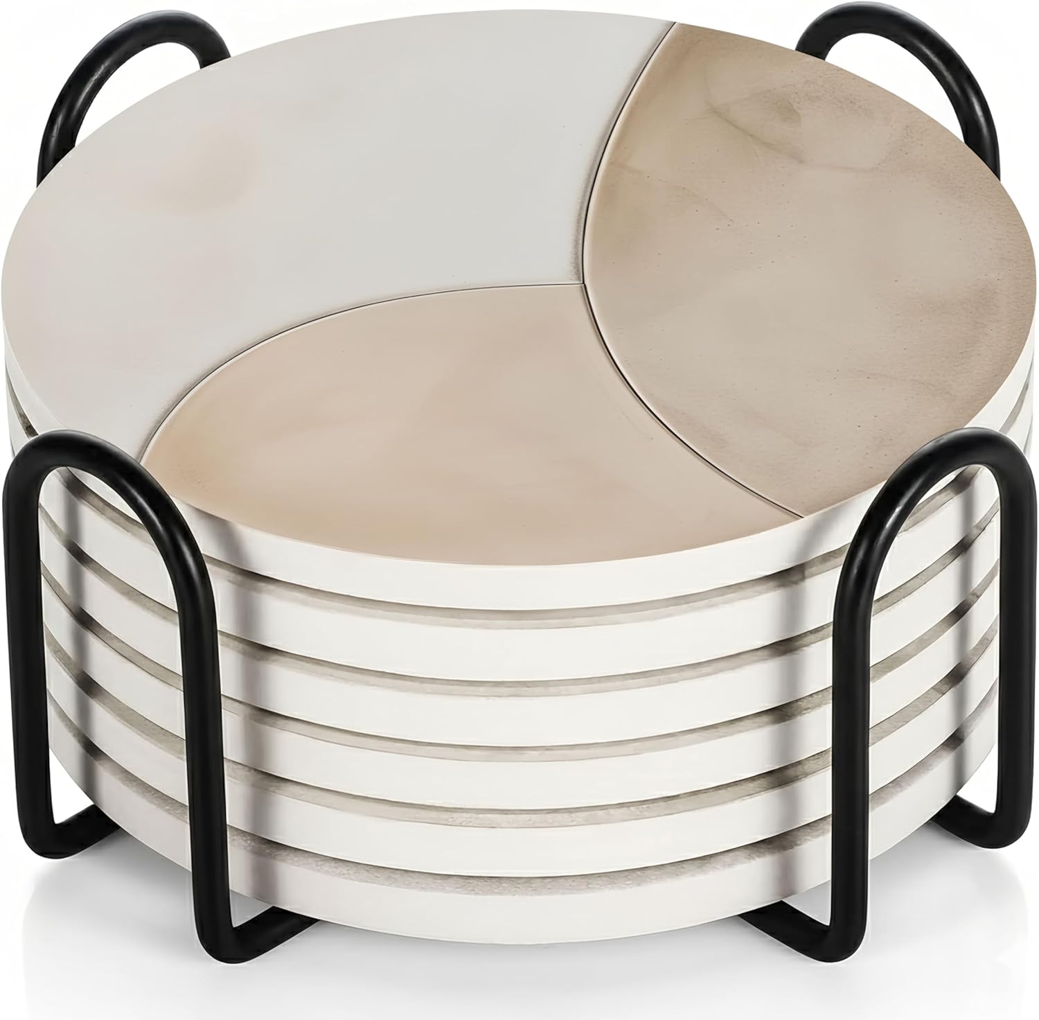 - INSIDE EVERY VEYRO SET: Each set includes 6 ceramic coasters (4" diameter, 0.28" thick) with a matte printed finish and soft cork backing that prevents slipping while creating a subtle floating effect, plus a sturdy black metal holder in smooth matte finish, all packed in a gift-ready box. The size was chosen with intention — wide enough for tumblers, mugs, wine glasses, or cocktails, yet balanced for smaller cups, candles, or planters. Each coaster carries a satisfying weight that feels premium in hand, combining elegance with everyday function to create a versatile piece that protects and decorates beautifully.