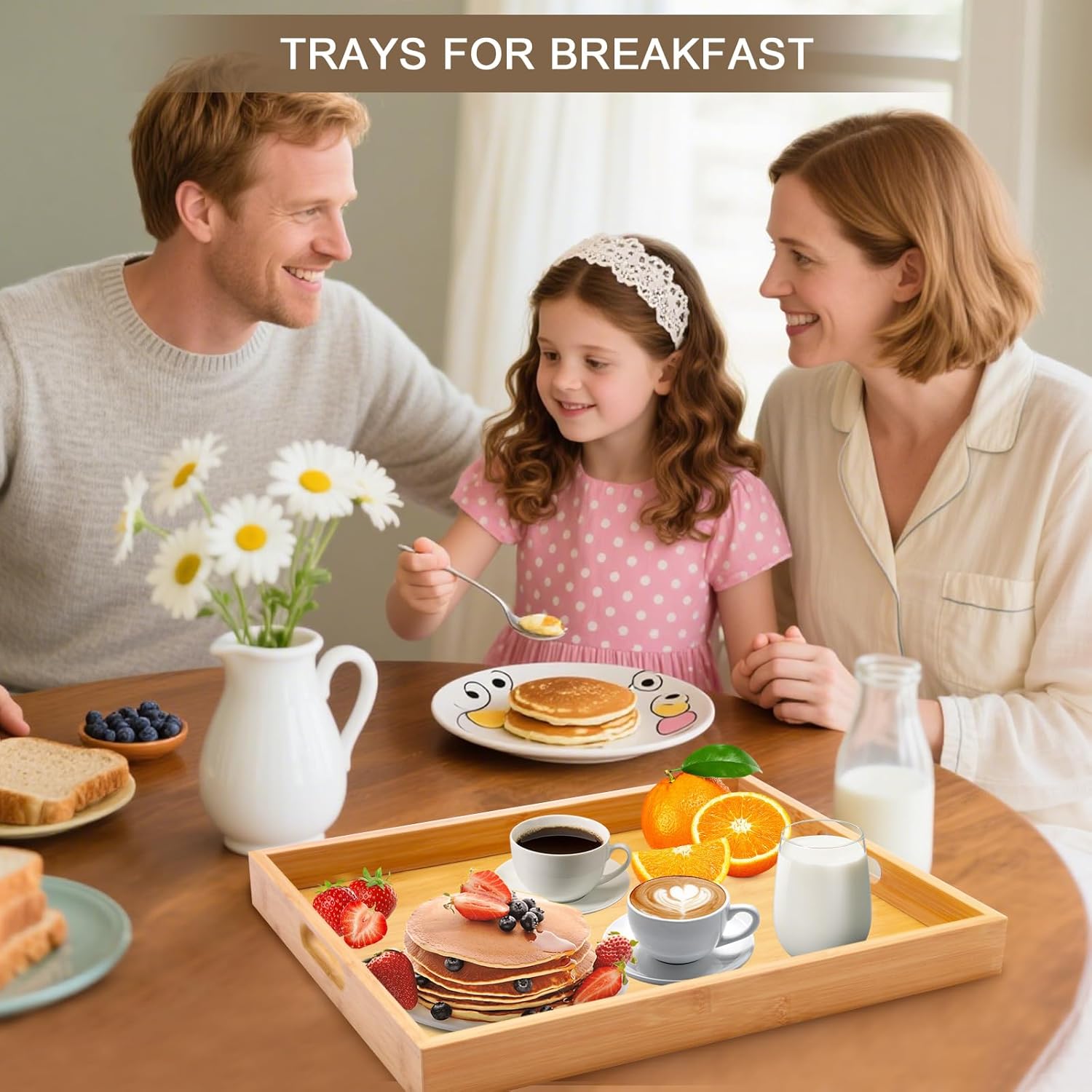 Wooden Serving Tray with Handles Bamboo Decorative Large Coffee Table Food Trays for Breakfast Dinner Restaurants Party or Home Decor Outdoor Scenarios 2 Packs