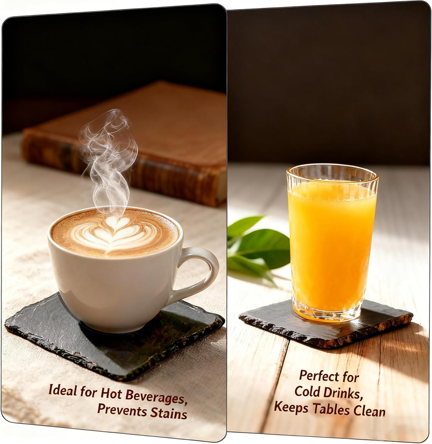 - ❍ 𝐏𝐫𝐚𝐜𝐭𝐢𝐜𝐚𝐥 𝐃𝐞𝐬𝐢𝐠𝐧 >>>Features Our slate stone coasters not only look great but also provide practical functionality. Their textured surface prevents glasses from slipping and spilling, ensuring your tabletops stay clean and dry. The heavy weight and stable base make them ideal for holding drinks securely, while their sleek design adds a touch of sophistication to any occasion.