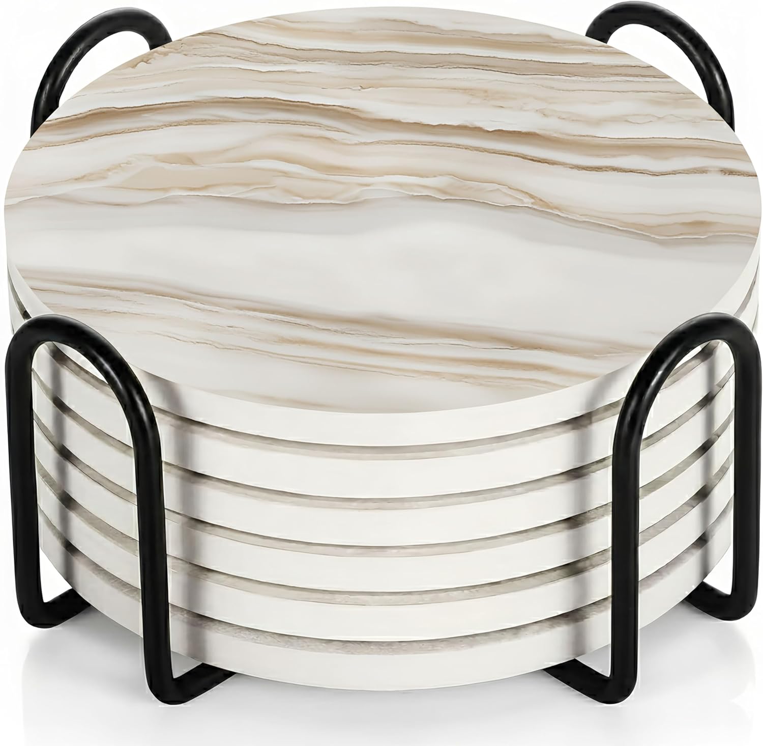 - INSIDE EVERY VEYRO SET: Each set includes 6 ceramic coasters (4" diameter, 0.28" thick) with a matte printed finish and soft cork backing that prevents slipping while creating a subtle floating effect, plus a sturdy black metal holder in smooth matte finish, all packed in a gift-ready box. The size was chosen with intention — wide enough for tumblers, mugs, wine glasses, or cocktails, yet balanced for smaller cups, candles, or planters. Each coaster carries a satisfying weight that feels premium in hand, combining elegance with everyday function to create a versatile piece that protects and decorates beautifully.