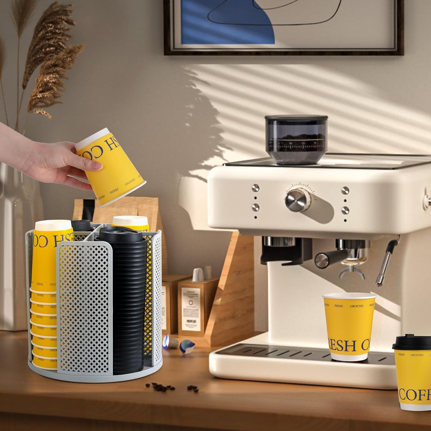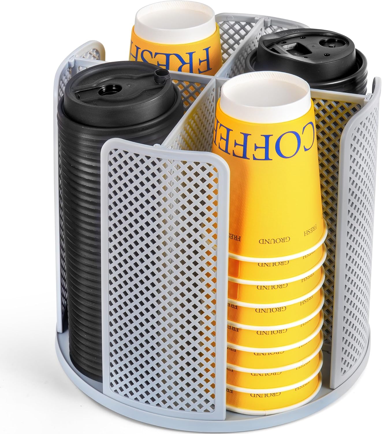 4-Compartment Rotating Paper Cup Holder & Coffee Cup Lid Storage Dispenser, Plastic Cup Dispenser Removable, Space-Saving Countertop Cup Holder for Coffee Bars, Kitchens (Grey)