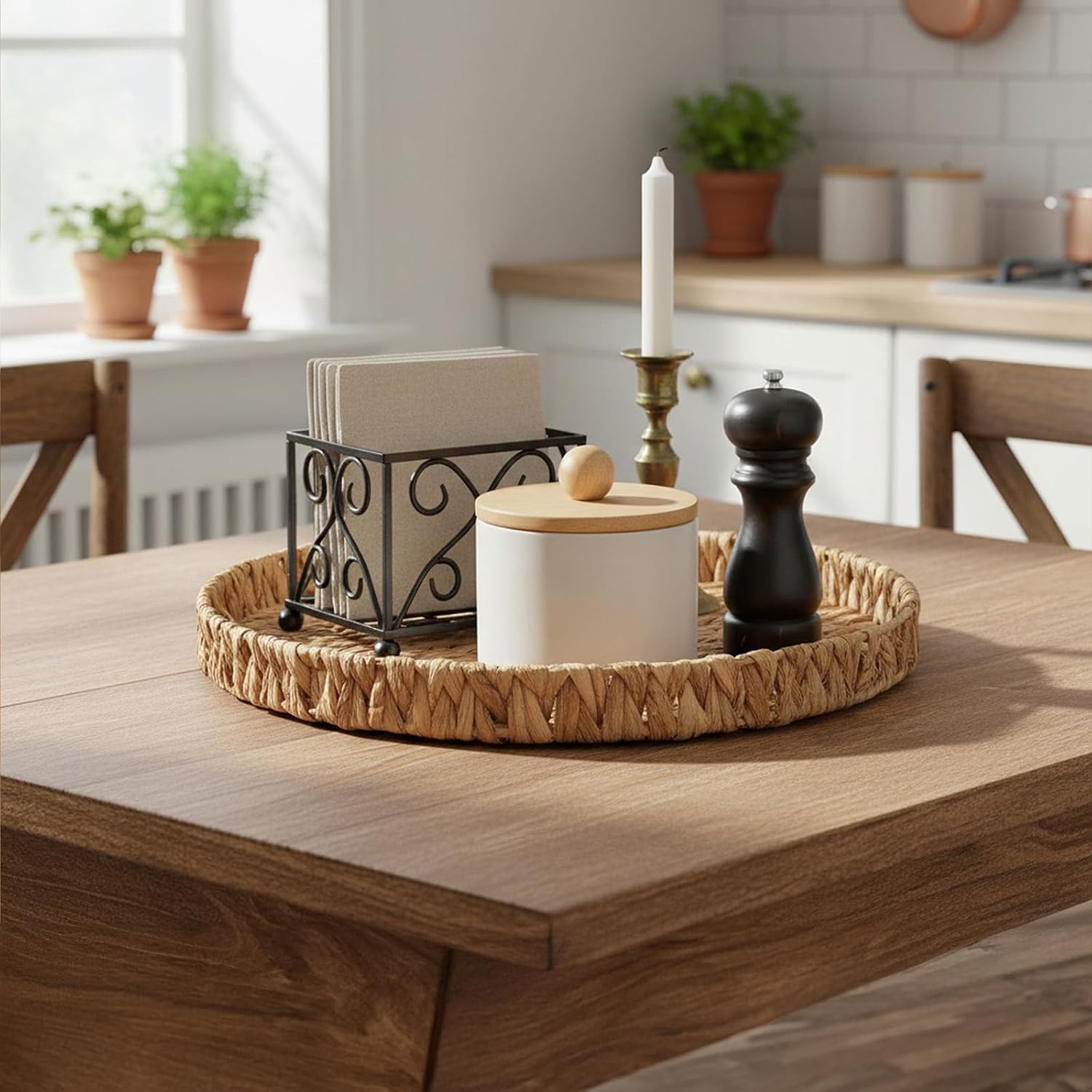 - Natural Material: Crafted from sustainably sourced natural water hyacinth, each tray is handwoven over a sturdy iron frame, ensuring both strength and long-lasting durability