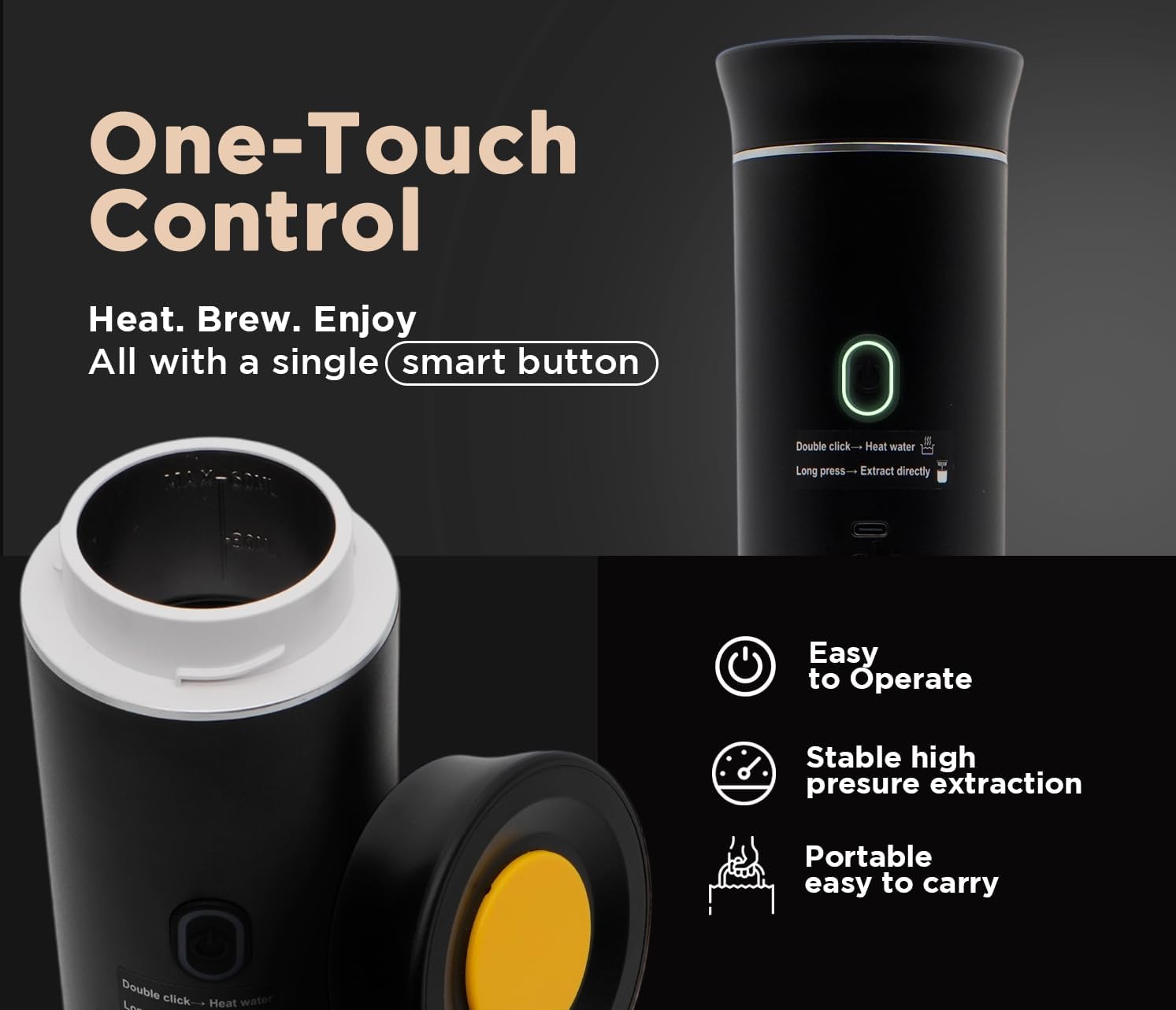 - USB-C Charging & Powerful Battery: With a built-in 7500mAh rechargeable battery, this portable electric espresso machine supports up to 5 uses with cold water. USB-C port supports car adapters, power banks, and more—your coffee companion wherever you go.