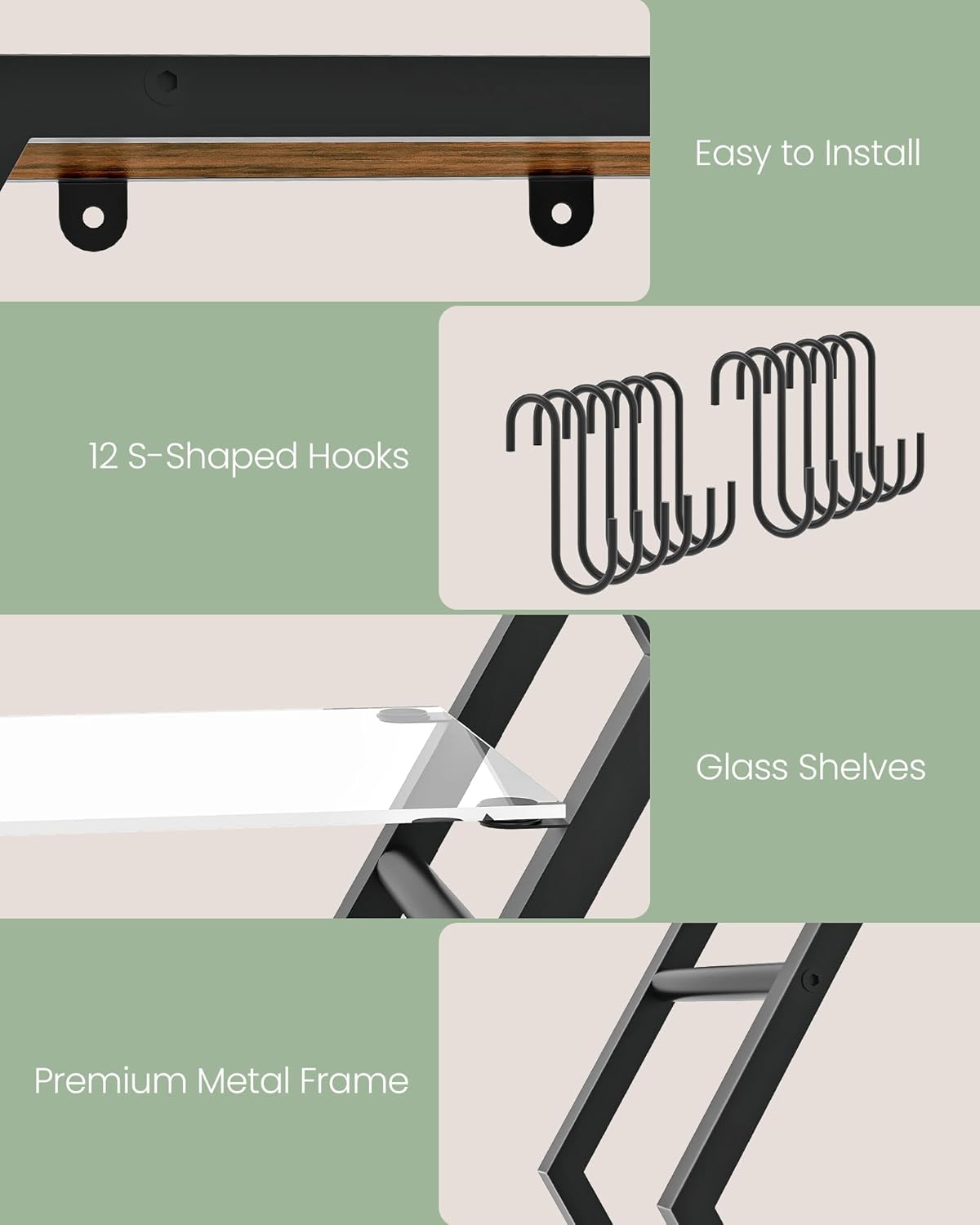 - Versatile for Multiple Scenarios: Six horizontal rods on the side of the shelves come with 12 S-shaped hooks for hanging keys, mugs, gardening tools, or gaming controllers. The floating shelves deliver versatile functionality across various home settings
