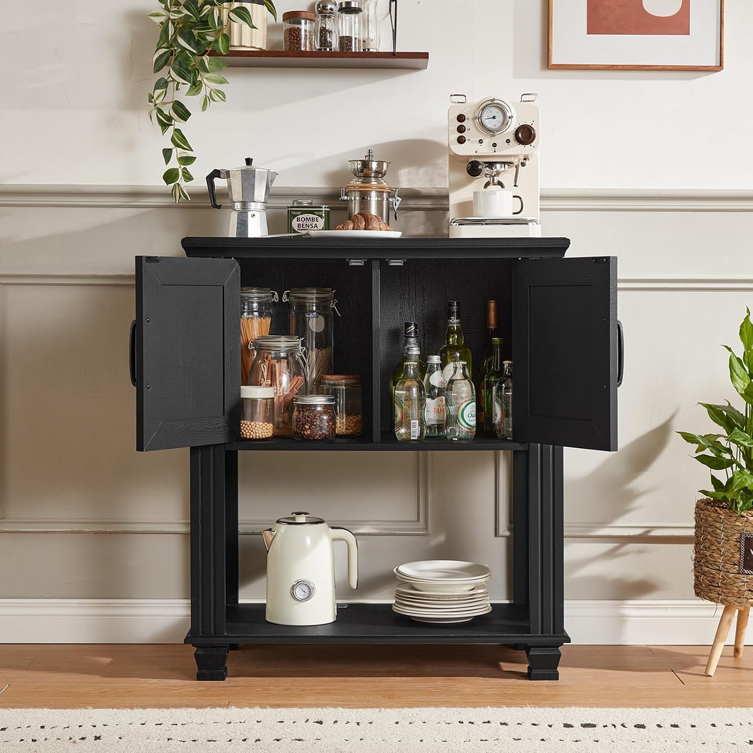 Farmhouse Coffee Bar Station with 2-Door Cabinet, Small Kitchen Cabinet with Open Lower Shelf, Entryway Table with Storage for Dining Room, Kitchen, Hallway, Living Room, Black