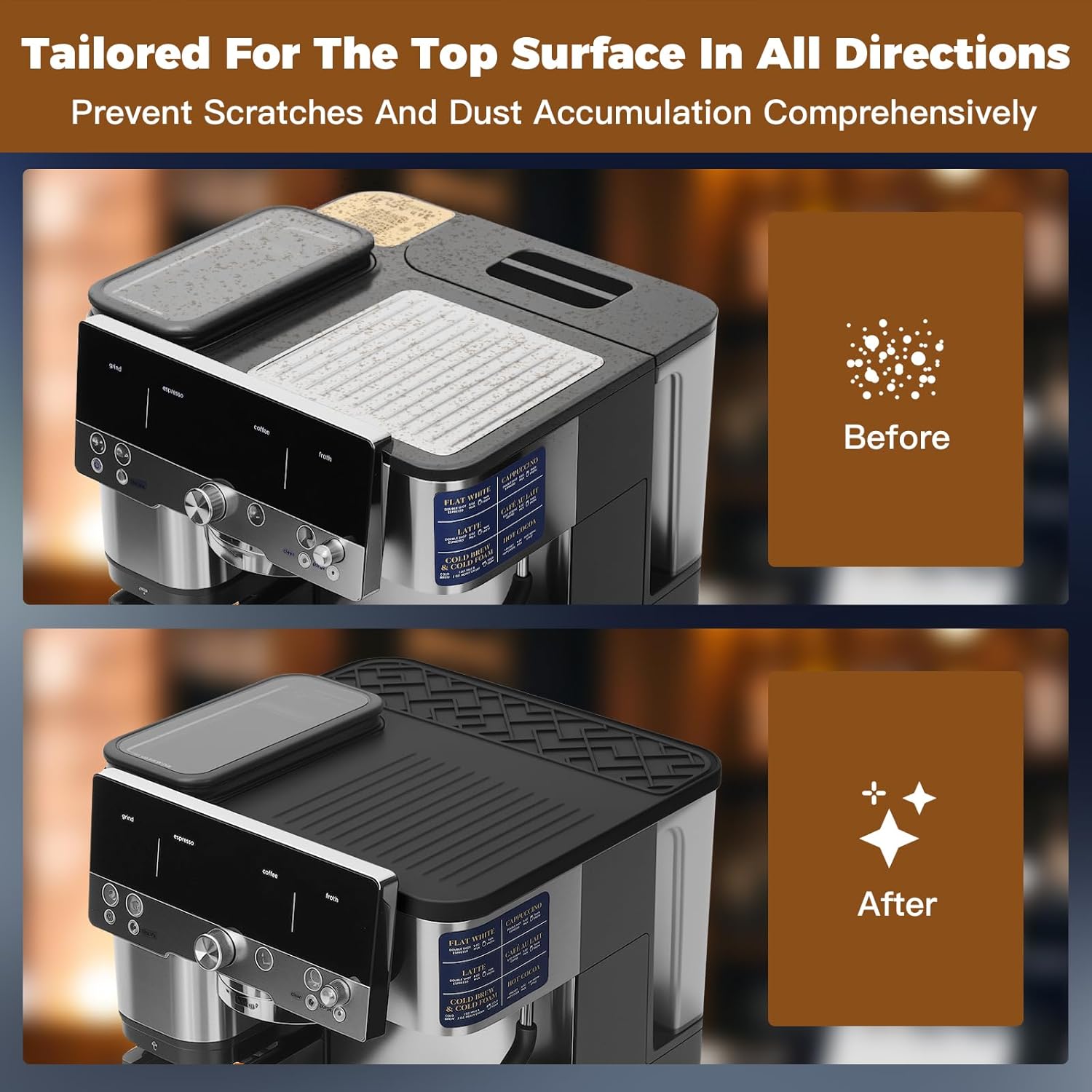 - Custom Fit for Ninja Luxe Cafe ES601: Tailored for the top of the Ninja Luxe Cafe Espresso Machine ES601 & ES701 comprehensively. Edge fitting structure and 90° corner design fit the top surface tightly, prevent the top mat from slipping or shifting, keep full machine functionality. It works seamlessly as ninja espresso machine accessories. No need to open the grinder, ensure full usability and a seamless look.