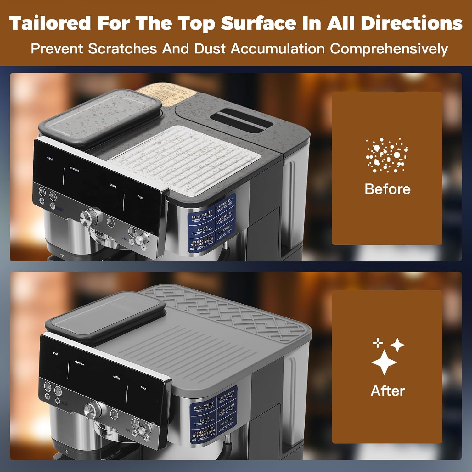 - Custom Fit for Ninja Luxe Cafe ES601: Tailored for the top of the Ninja Luxe Cafe Espresso Machine ES601 & ES701 comprehensively. Edge fitting structure and 90° corner design fit the top surface tightly, prevent the top mat from slipping or shifting, keep full machine functionality. It works seamlessly as ninja espresso machine accessories. No need to open the grinder, ensure full usability and a seamless look.