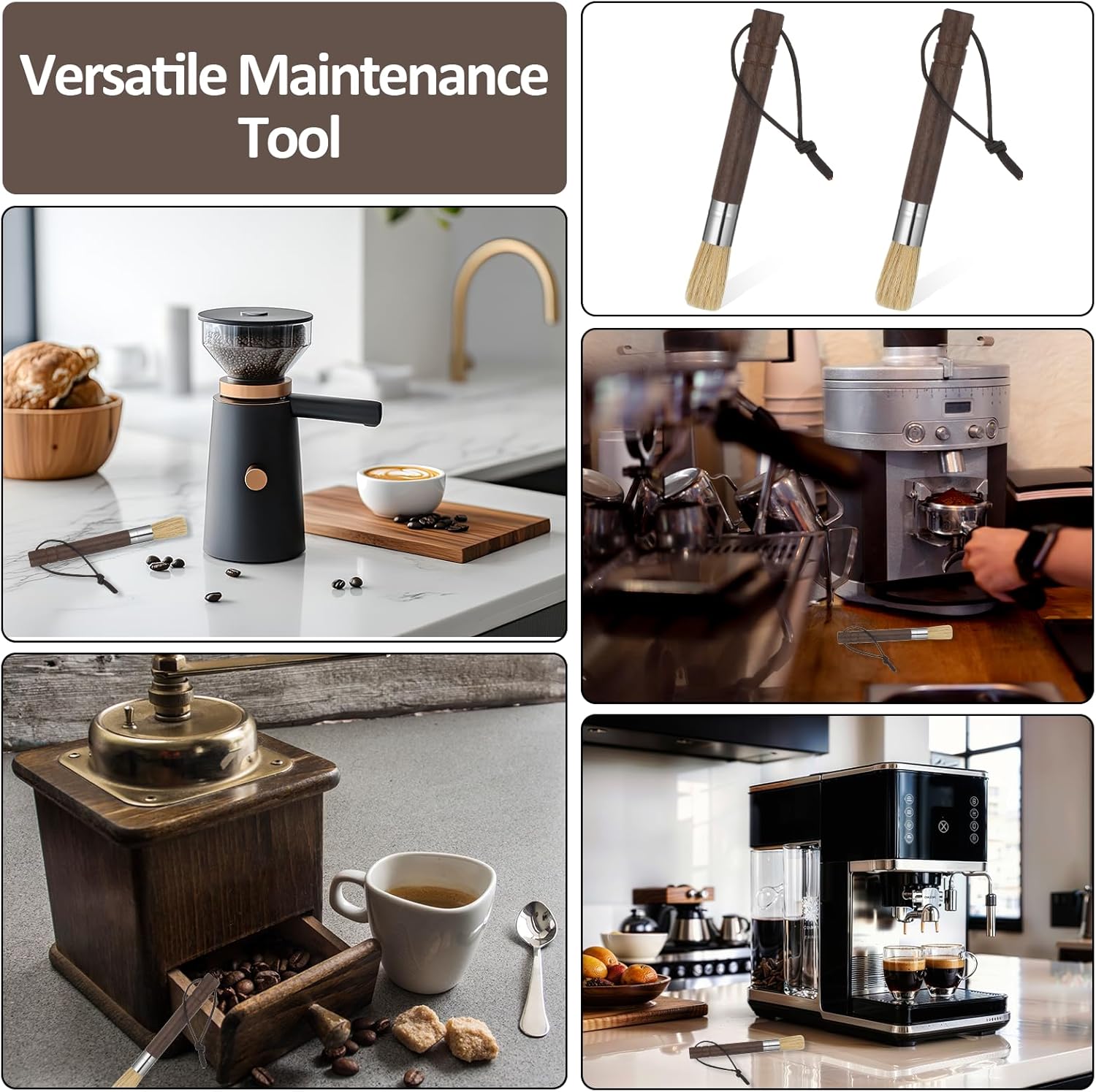 - Natural Bristle Cleaning Brush: The natural bristles effectively remove coffee grounds from grinders and espresso machines. The firm, dense bristles ensure a thorough clean of your coffee grinder. The perfect espresso brush.