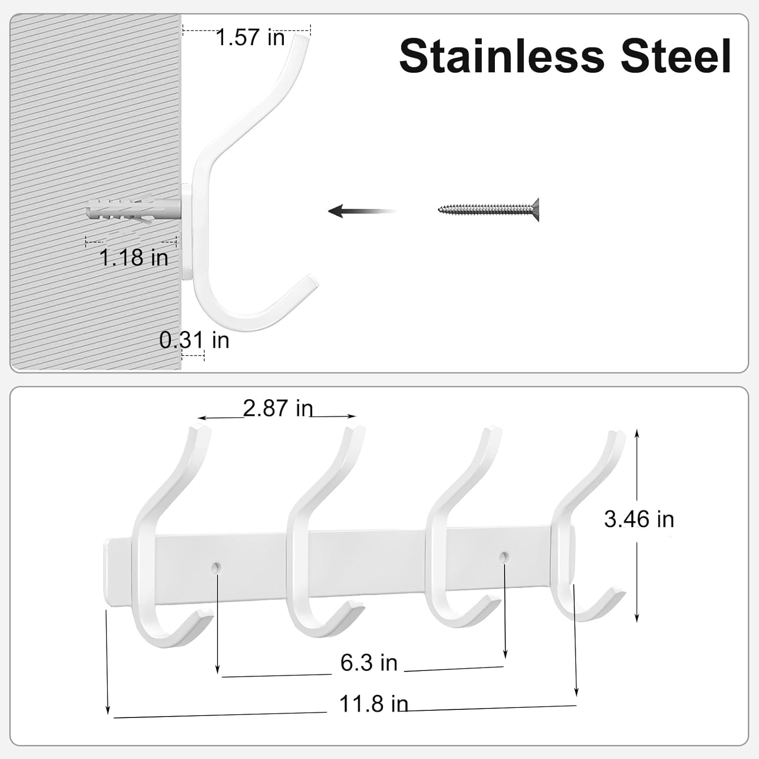 White Wall Hooks Heavy Duty, 12 Inch Coat Hooks Wall Mount with 4 Hooks, 2 Packs Wall Hooks Hangers for Entryway, Bathroom - for Hanging Backpack, Bag, Coat, Purse, Hat, Towel, Clothes