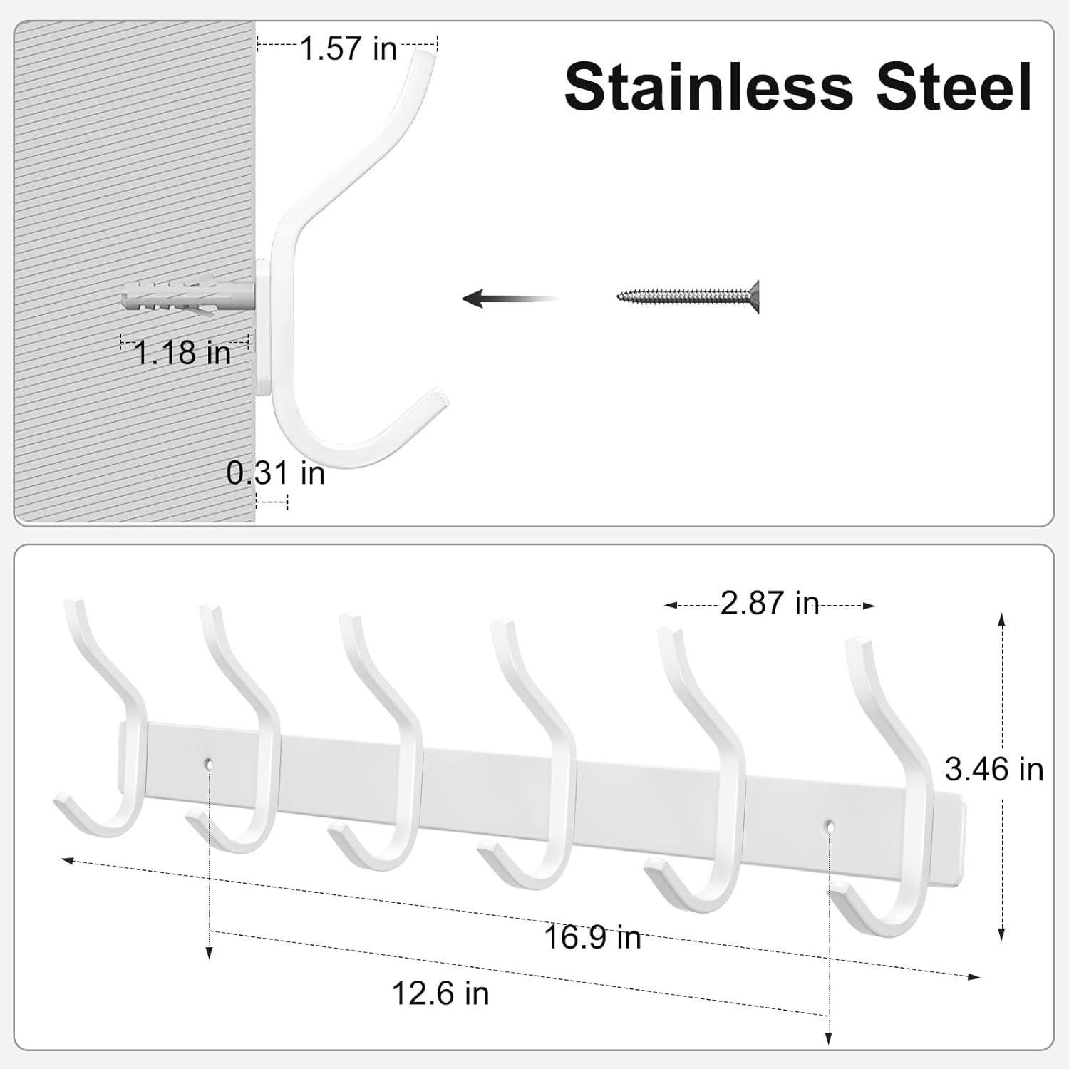- 【Easy Installation】: White wall hook rack include all necessary hardware—screws, anchors, and caps—for quick and secure mounting on walls