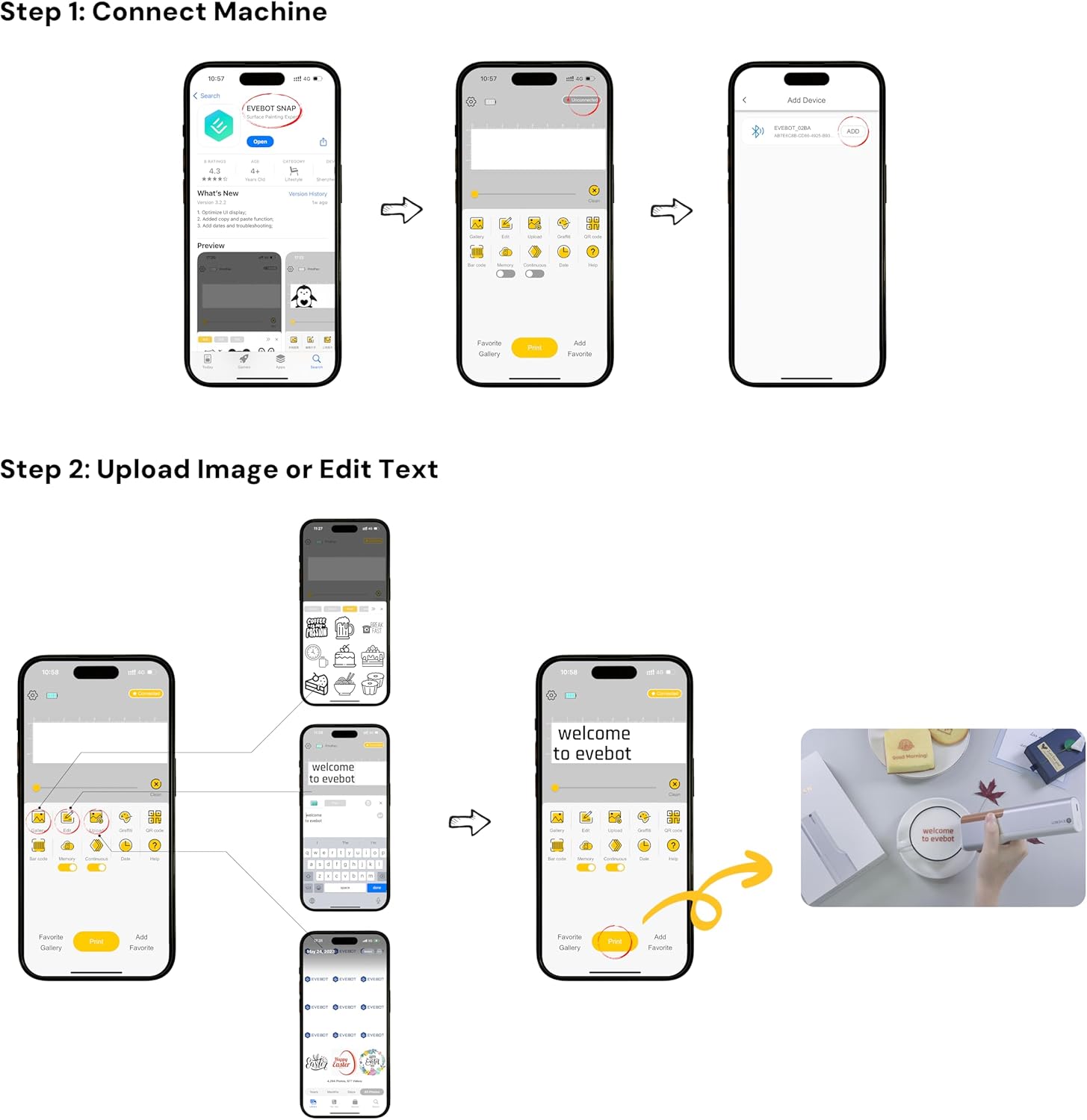 - 【Compact & Portable Design】With a sleek body measuring 174 × 53 × 30 mm and weighing only 255g, this handheld device is easy to carry and store. Each print area measures 26 × 50 mm, with up to 7,000 uses per cartridge. Connect via Bluetooth 4.2 using the EVEBOT SNAP app.