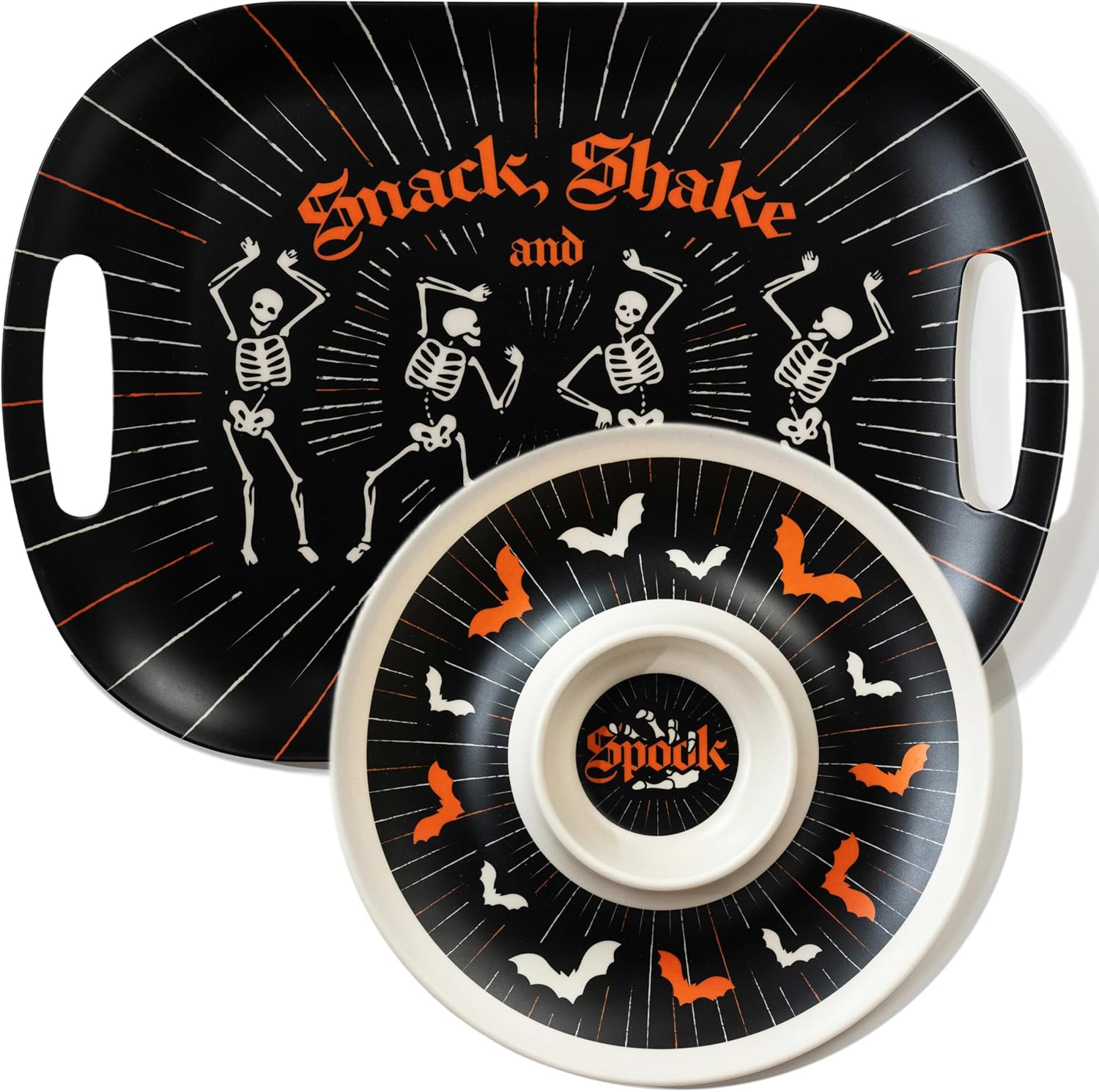 Oasis Choice 2-Pack Halloween Skeleton Serving Trays, 18" Large Handled Tray & 13" Chip & Dip Platter for Horror Party, BBQ, picnics and Birthday Decor (Bamboo Fiber, Black, 18inch)