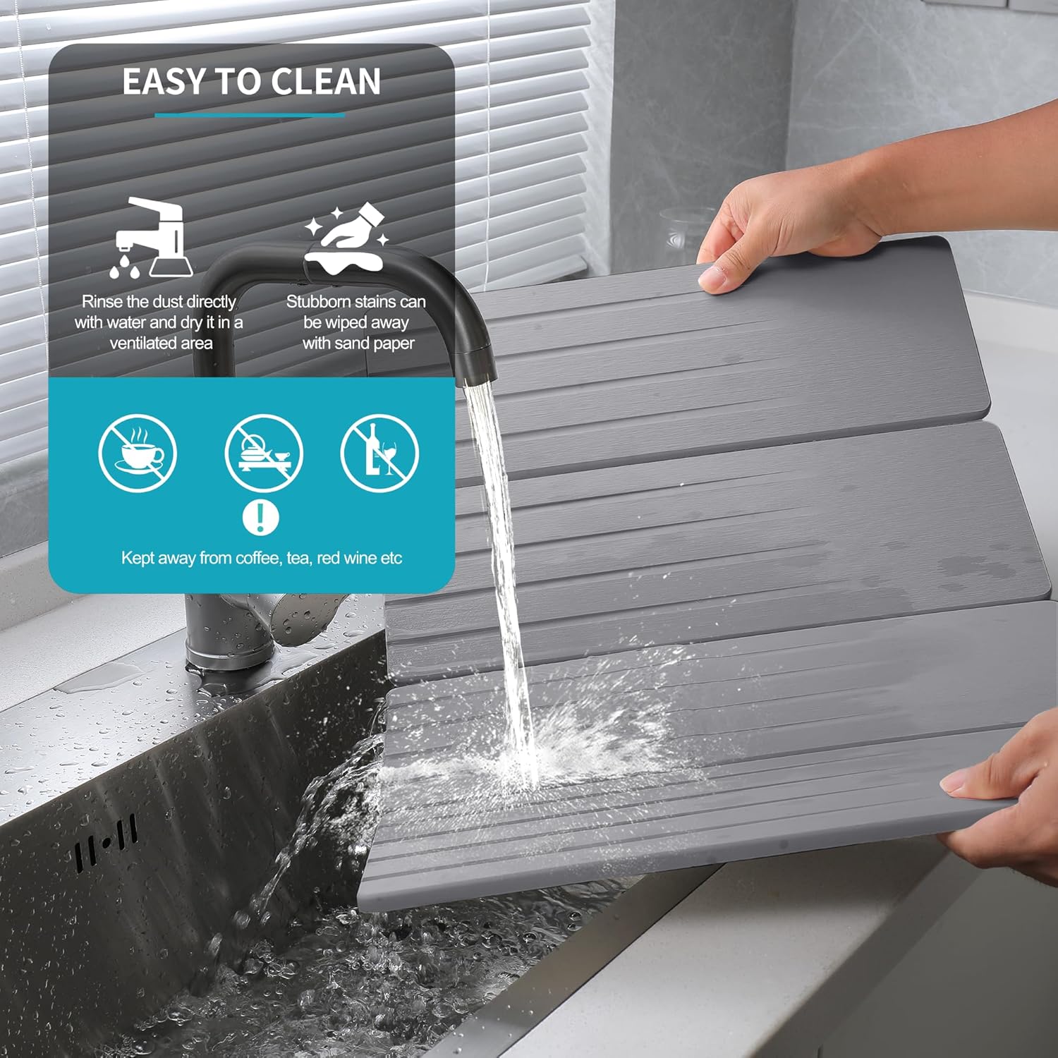 - Collapsible and Space-Saving: Measuring 23.62x15.35'' when unfolded, this collapsible stone drying mat offers ample space for your dishes. When not in use, easily store it in drawers or kitchen cabinets, maximizing your kitchen's organization