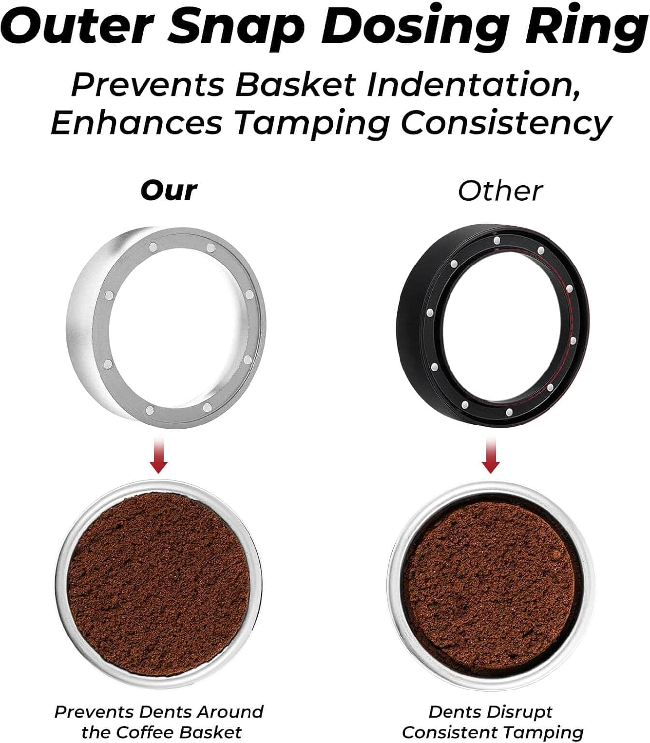 - EASY REMOVAL - Ergonomic arc design on the 58mm Coffee Dosing Ring ensures a comfortable grip and effortless removal after dosing.