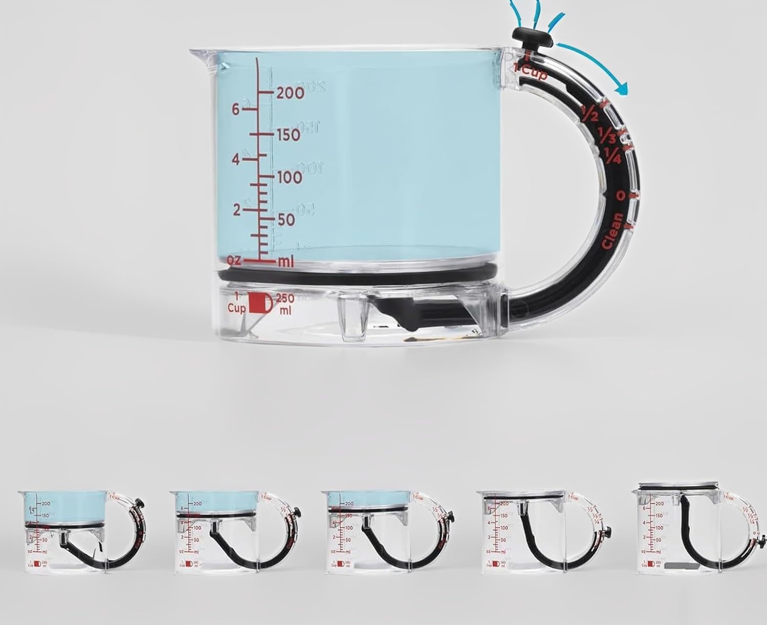 - 【All-in-1 Adjustable Measuring Cup】Save space in your kitchen with this 4-in-1 adjustable measuring cup. Measures ¼, ⅓, ½, and 1 cup, perfect for baking, cooking, and portioning both liquids and dry ingredients.
