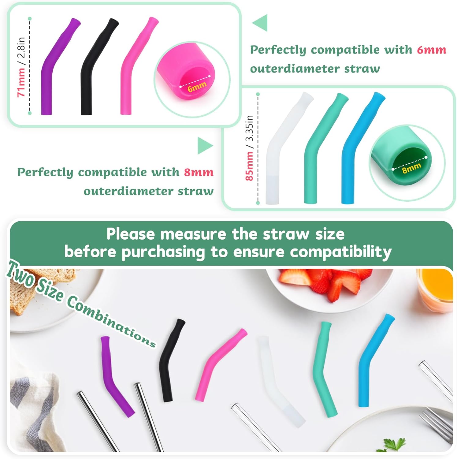 - Dual-Size Combination: The set includes 6 pcs silicone straw tips which is in 6 different colors and 2 size, specifically designed for 6mm (0.23in) and 8mm (0.31in) outer diameter straws. Please measure your straw diameter to ensure compatibility