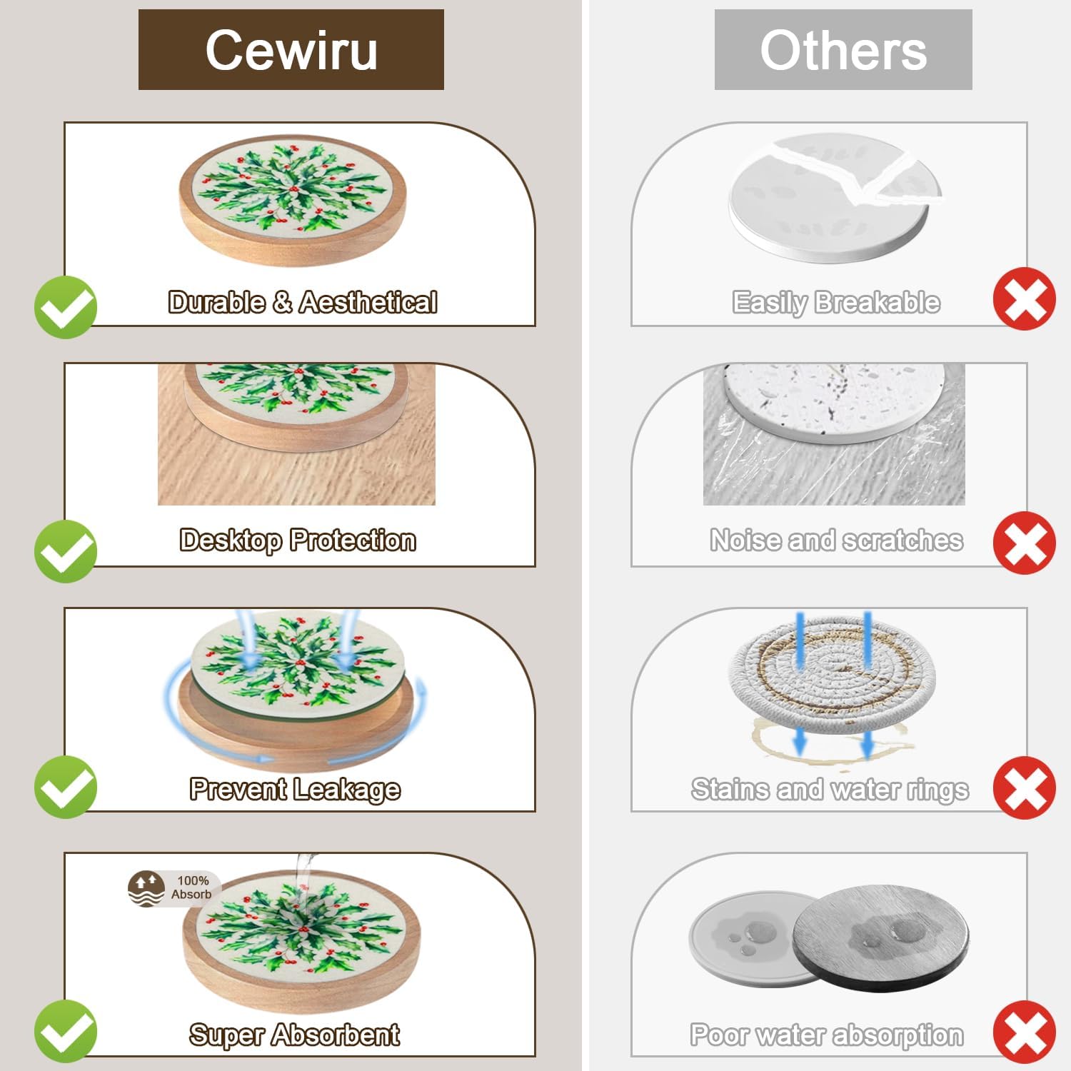 - Non-stick & Coaster with Holder: Cup coaster is thick and flat, good moisture absorption can effectively isolate adhesion forces, prevents coaster from sticking to glasses; durable & aesthetical, non-breakable, suitable for hot and cold drinks, effortlessly protects your furniture, tabletops & counter top, brings your pleasant drinking experience.