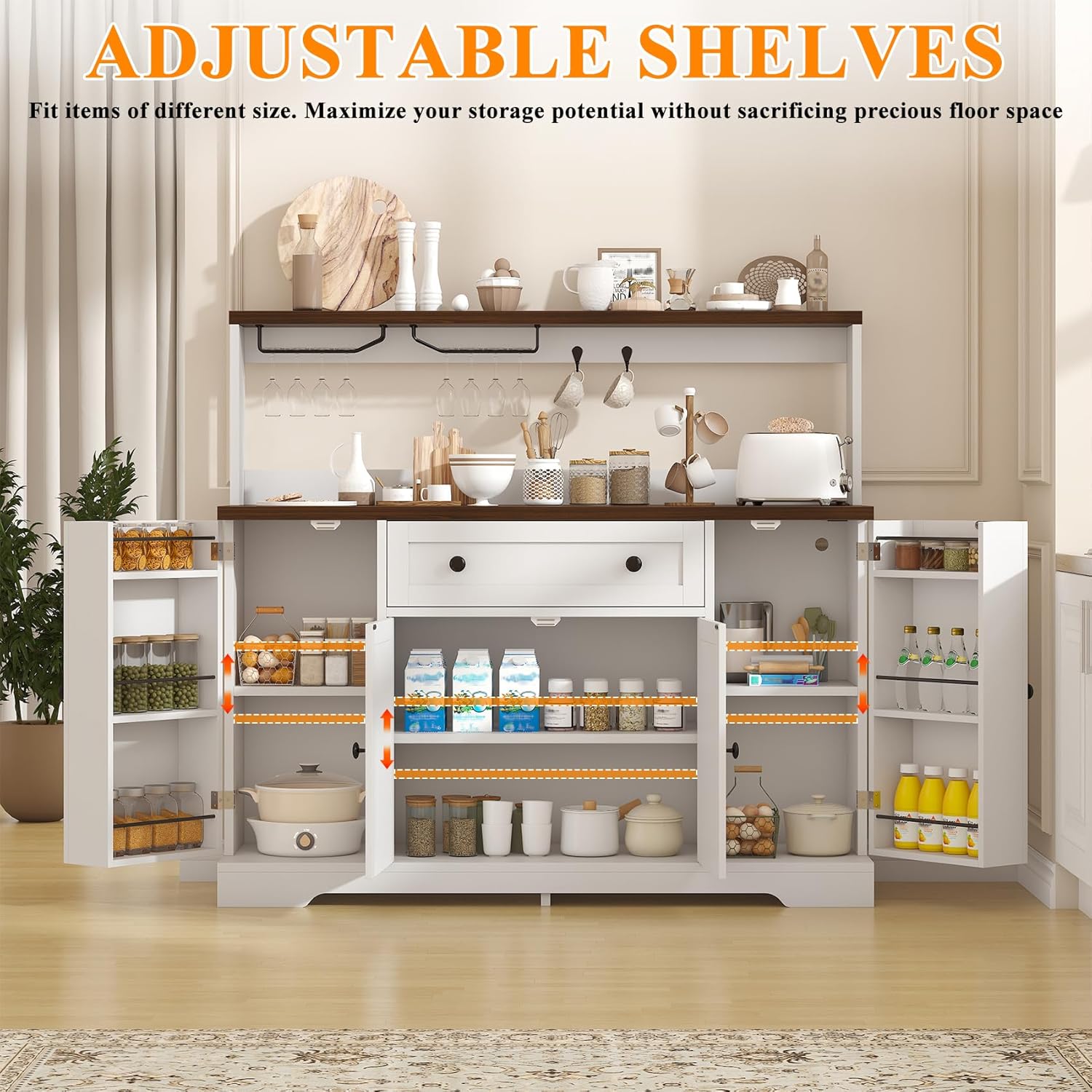 - 【Large Divided Storage】Say goodbye to clutter. The spacious countertop can accommodate coffee makers or microwave ovens. The doors withThe drawers of the coffee bar cabinet make your essentials close to hand. Bottom cabinet can easily store dishes and a side door open to reveal three racks for drinks, snacks or seasoning.