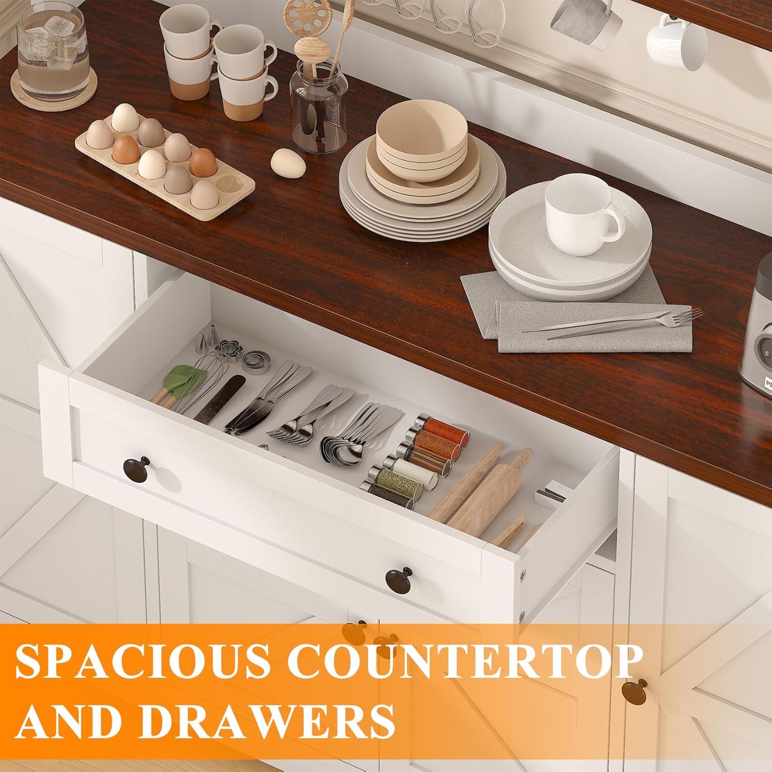Hutch Storage Buffet Cabinet with Drawers, and Charging Station, Coffee Bar Cabinet with Barn Doors, Wine Rack and Hooks, White Wood Sideboard Buffet for Kitchen, Dining Room, 47.8" High