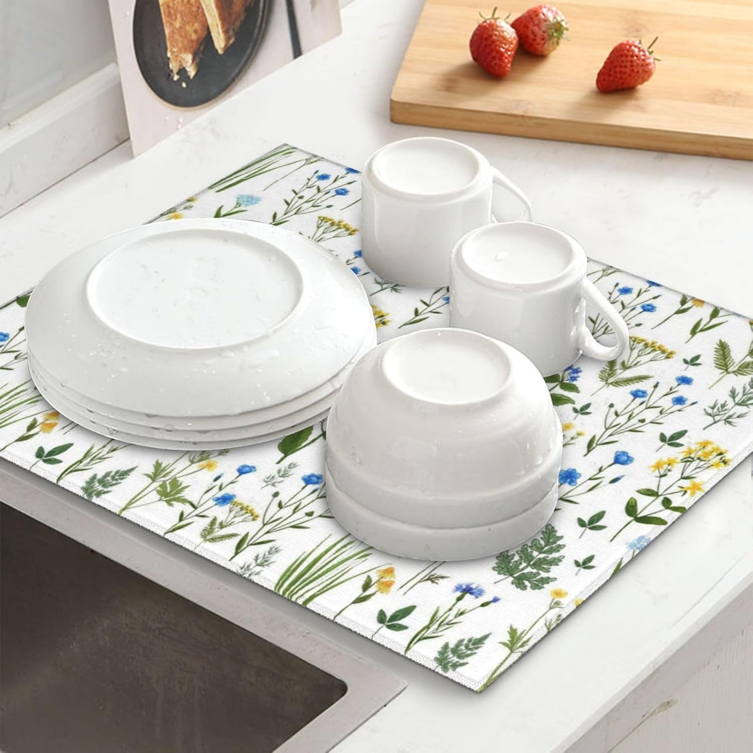 - Unique Blue Yellow Wildflower & Fern Design: Stand out with this cute decorative drying mat featuring a nature-inspired pattern of blue and yellow wildflowers and ferns. It’s not just an absorbent drying mat but also a serene kitchen counter mat that adds a touch of countryside charm to your kitchen decor, perfect as a countertop drying mat with botanical flair