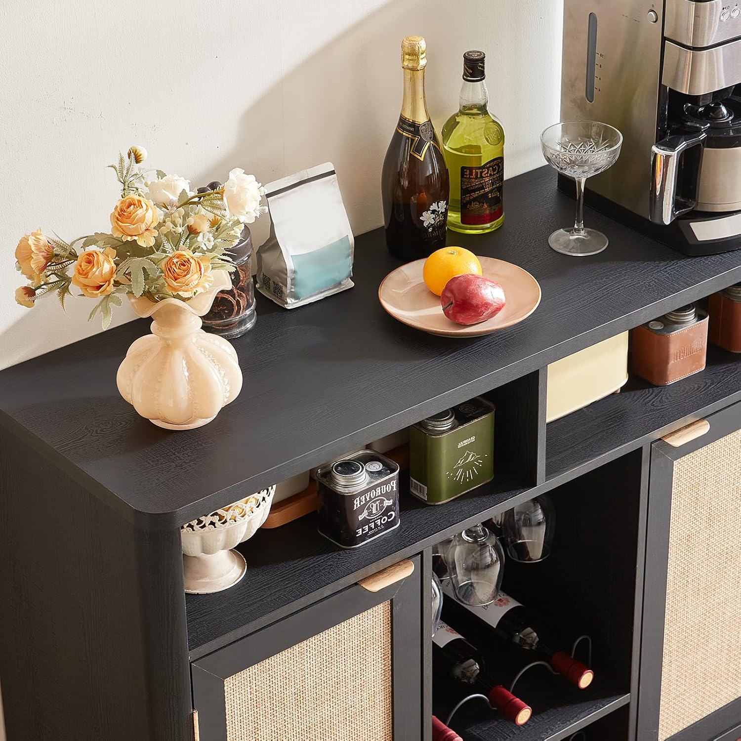 Lerliuo 47.2" Rattan Wine & Liquor Cabinet with 2 Doors, Boho Farmhouse Coffee Bar Station, Built-in Wine Racks & Storage, Adjustable Shelves for Living Room, Dining Room, Kitchen, Black
